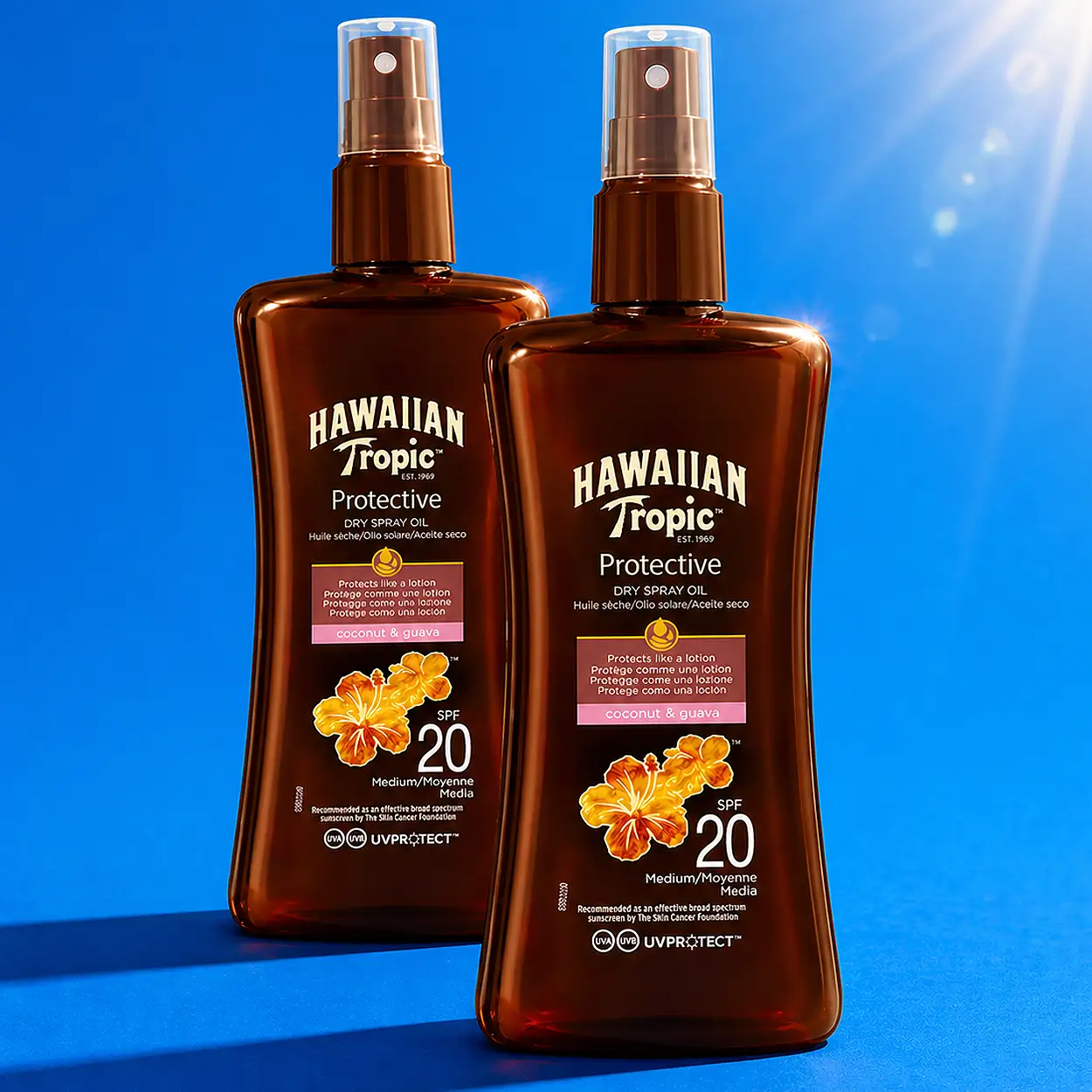 Stap in de zon met een glimlach, want de 2x Hawaiian Tropic Protective Dry Spray Oil SPF20Â combineert betrouwbare zonbescherming met een zijdezachte verzorging. Deze droge olie laat je huid stralen, zonder te plakken.