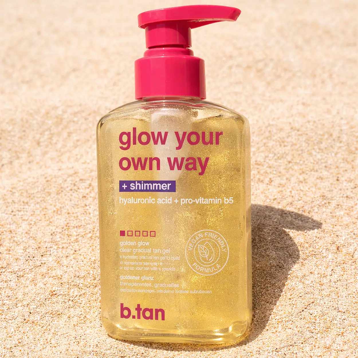 Creëer een stralende gouden glow met shimmer! Hydraterende zelfbruiner met hyaluronzuur en vitamine C. B.Tan Glow Your Own Wayv oor een egale, zongebruinde teint.