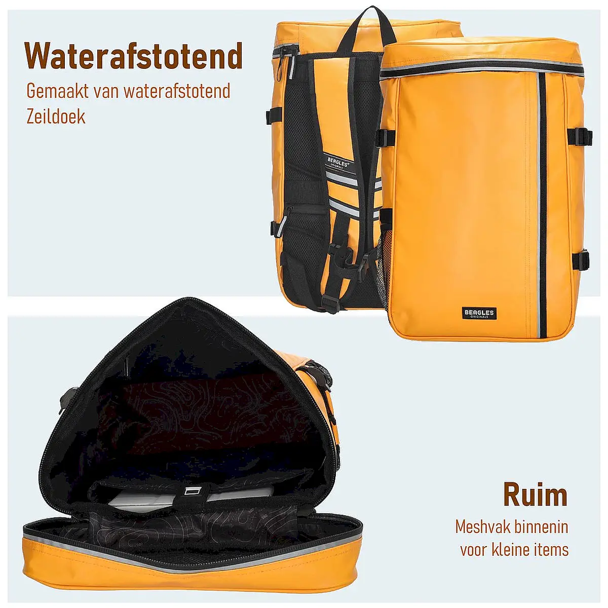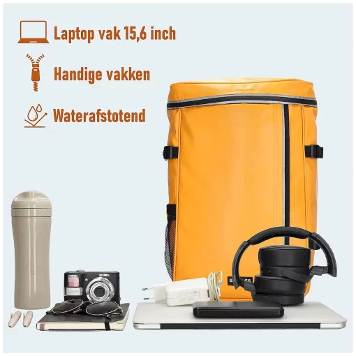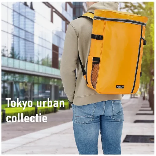 De Beagles Originals Tokyo Rugzak 15.6 inch in opvallend okergeel is jouw nieuwe onmisbare metgezel. Gemaakt van ultra-duurzaam tarpaulin, trotseert deze rugzak moeiteloos regen, wind én drukke werkdagen. Het slimme design combineert functionaliteit met flair: