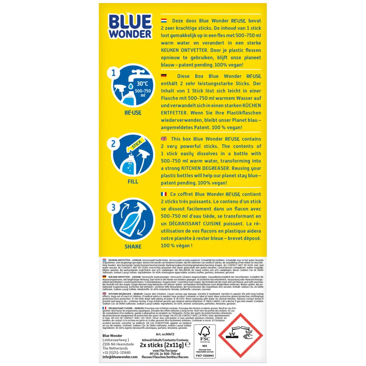 Bespaar plastic en reinig krachtig met Blue Wonder Herbruikbare Sticks Keuken Ontvetter. Vegan, chloorvrij en effectief tegen vet, kalk en vuil in keuken en badkamer.