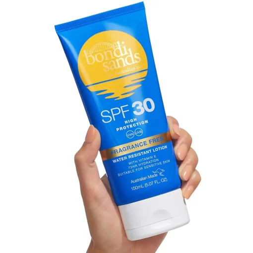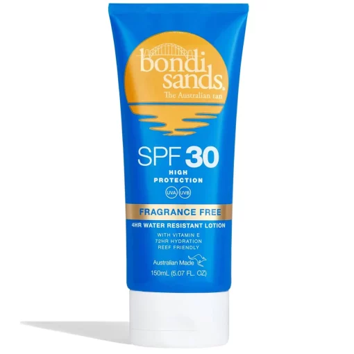 Bondi Sands SPF30 Zonnebrand 150ml is parfumvrij, waterbestendig en hydraterend tot 72 uur. Ideaal voor de gevoelige huid, met UVA- en UVB-bescherming.