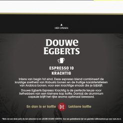 De Douwe Egberts Espresso Krachtig is een hoogwaardige koffie met een intense smaak en een intensiteit van 10/12. Deze koffie is speciaal ontwikkeld voor liefhebbers van sterke en krachtige espresso’s.