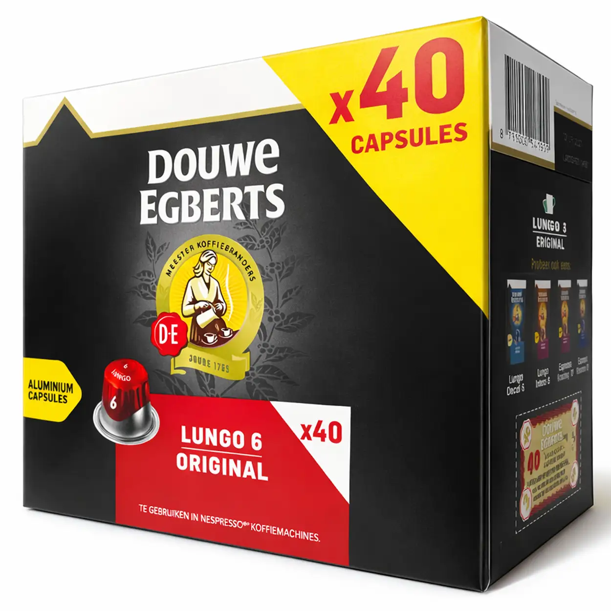 Zachte en ronde lungo met intensiteit 6. Douwe Egberts Lungo 6 Original 40 koffiecups, geschikt voor Nespresso® Original en L’OR Barista.