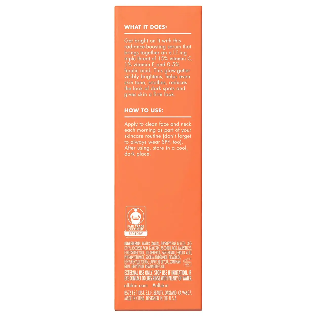 Geef je huid de glow die ze verdient met het e.l.f. SKIN Bright Icon Vitamine C + E + Ferulic Serum. Dit verhelderende gezichtsserum combineert een krachtige formule van 15% vitamine C, 1% vitamine E en 0,5% ferulinezuur voor een zichtbaar frissere, egalere huid. De krachtige antioxidanten helpen de huid te beschermen tegen invloeden van buitenaf terwijl ze de natuurlijke uitstraling versterken.