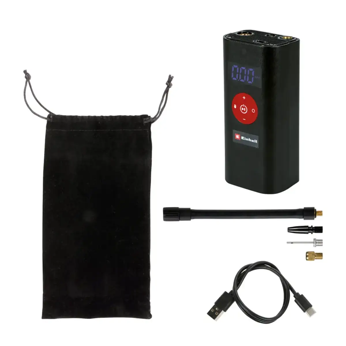 De Einhell TC-ALP 10 wordt geleverd met een 3-delige adapterset en een handige opbergtas, zodat je hem overal mee naartoe neemt. Of het nu gaat om je auto, fiets, sportbal of luchtmatras, met deze compacte luchtpomp ben je altijd voorbereid.