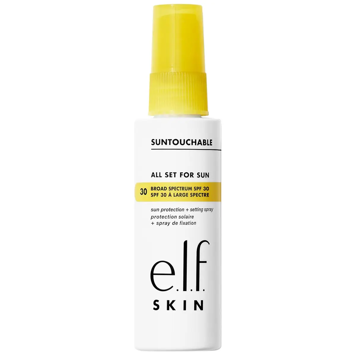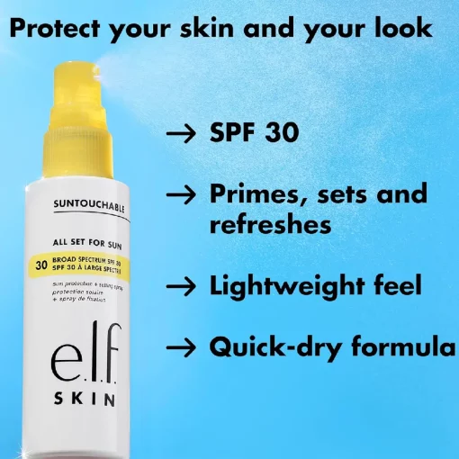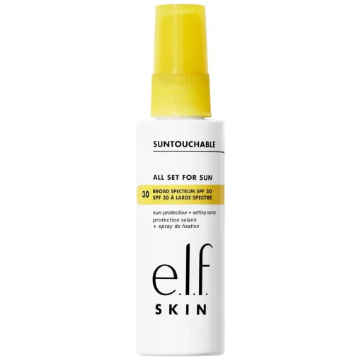 Maak kennis met de ELF SKIN Suntouchable All Set for Sun SPF30, de ultieme setting spray met zonbescherming! Deze innovatieve clear setting spray fixeert je make-up voor een langdurige, vlekkeloze look en beschermt tegelijkertijd je huid met breedspectrum SPF 30. Geen witte waas, geen vettig gevoel – alleen een frisse, onzichtbare zonbescherming die perfect is voor alle huidtypes.