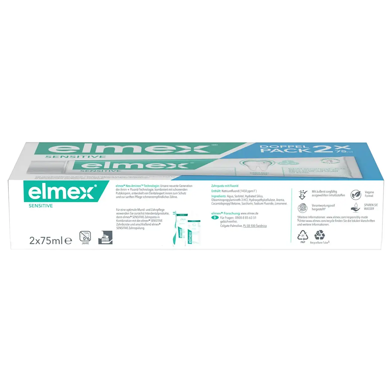 Bescherm gevoelige tanden tot 24 uur met Elmex Sensitive Tandpasta Duo Pack. Versterkt glazuur, voorkomt gaatjes en reinigt zacht. Vegan & effectief!