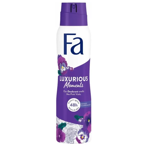 Ervaar 48 uur bescherming met Fa Luxurious Moments Deospray 150ml. Verleidelijke geur, huidvriendelijk en zonder witte strepen. Voor ultieme frisheid en stijl.