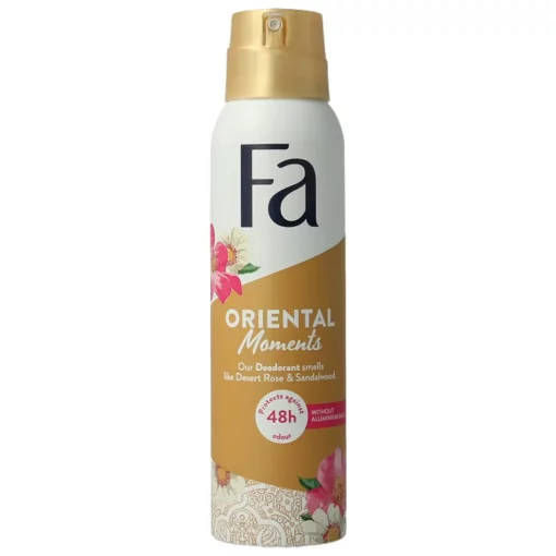 Ontdek Fa Oriental Moments Deodorant Spray 150ml: 48 uur bescherming, zonder aluminiumzouten. Met woestijnroos en sandelhout voor een betoverend frisse geur!