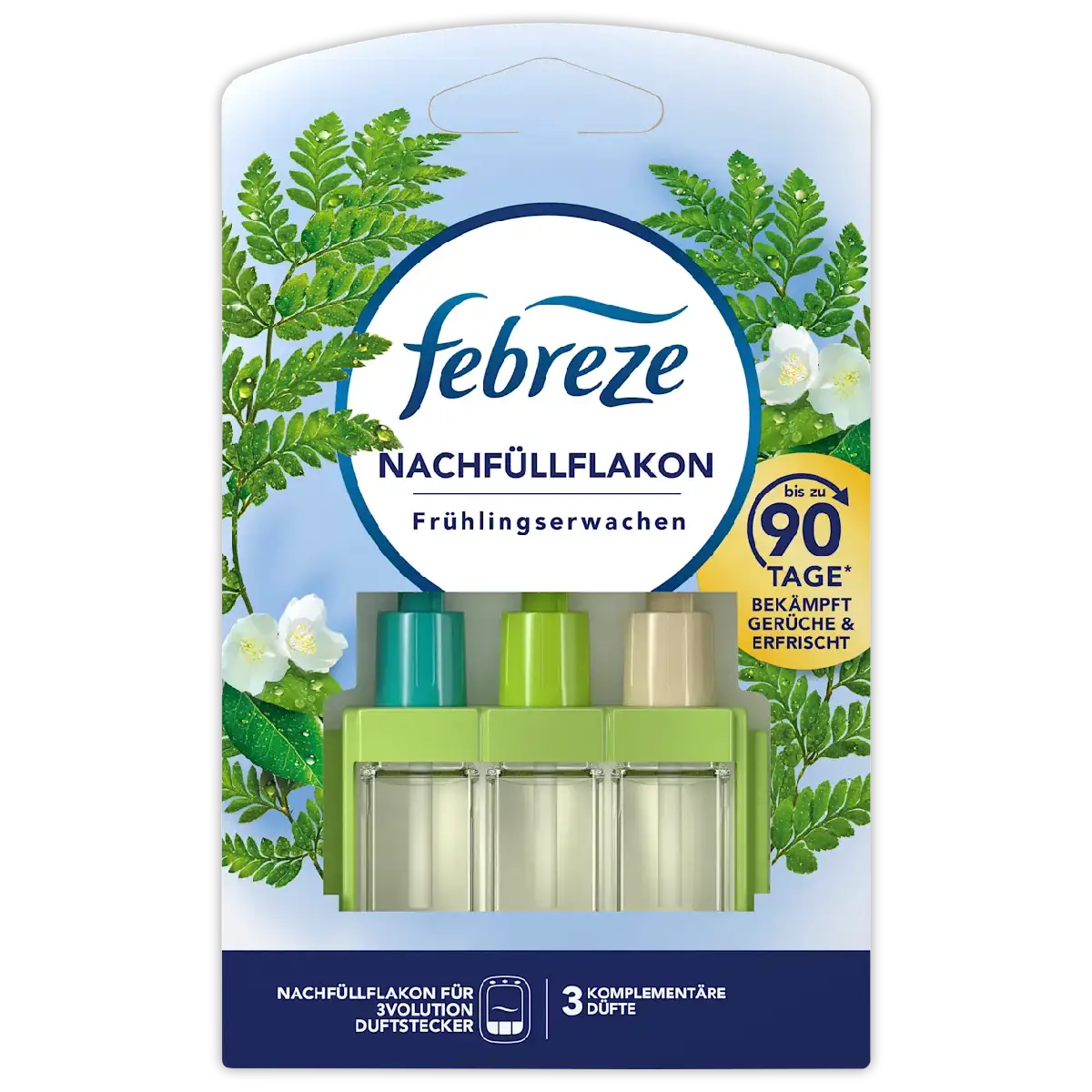 Geniet 90 dagen lang van frisse lentegeur met Febreze 3Volution Navulling Spring Awakening. Elimineert geuren en wisselt 3 geuren automatisch af.