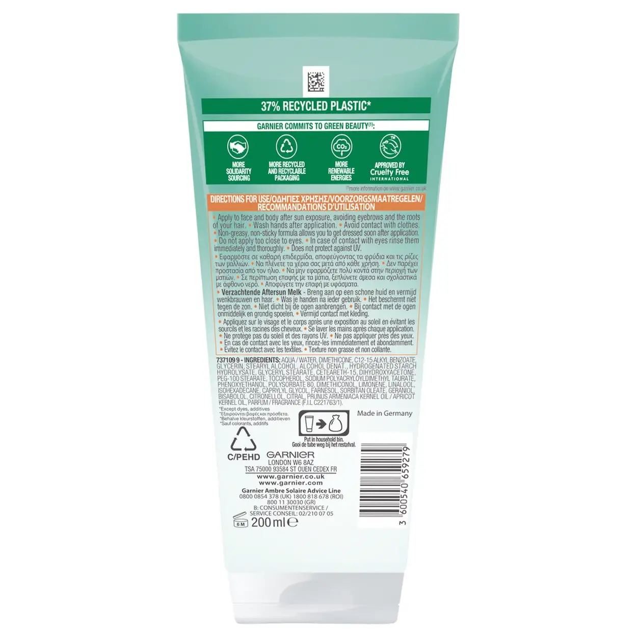 Niet alleen goed voor je huid, maar ook voor de planeet. De fles is gemaakt van 100% gerecycled plastic en Garnier is officieel Cruelty Free gecertificeerd. Zo combineer je een stralend uiterlijk met een goed gevoel. De aftersun ondersteunt en verlengt je natuurlijke bruining zonder strepen of vlekken, voor een gelijkmatige glow die gezien mag worden. Smeer goed uit, was na gebruik je handen en geniet van een gezonde, zomerse uitstraling — elke dag opnieuw.