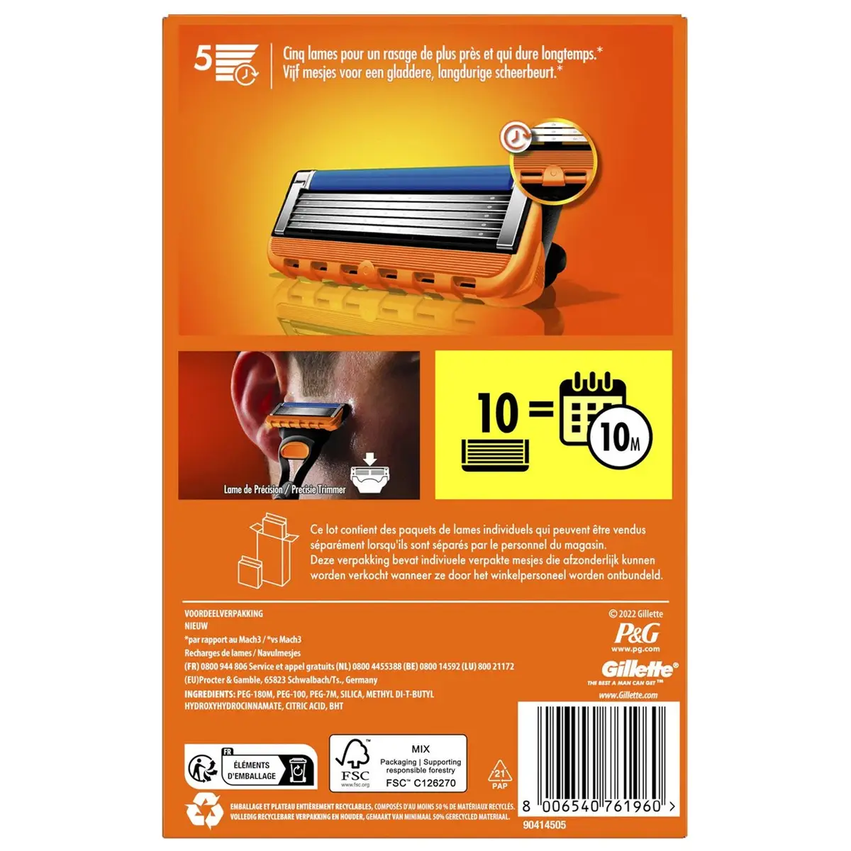 Geniet van langdurig glad scheren met Gillette Fusion5 Navulmesjes 10-Pack. Met 5 anti-irritatiebladen en een precisietrimmer voor perfecte controle.