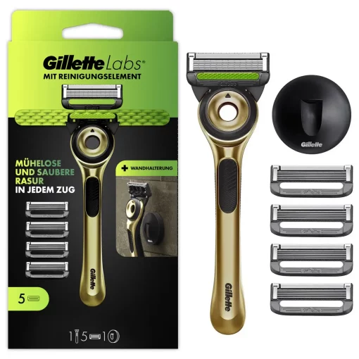 Ontdek de Gillette Labs Gold Scheermes met Wandhouder en 5 mesjes. Voor glad scheren zonder irritatie, thuis én onderweg – stijlvol en krachtig.