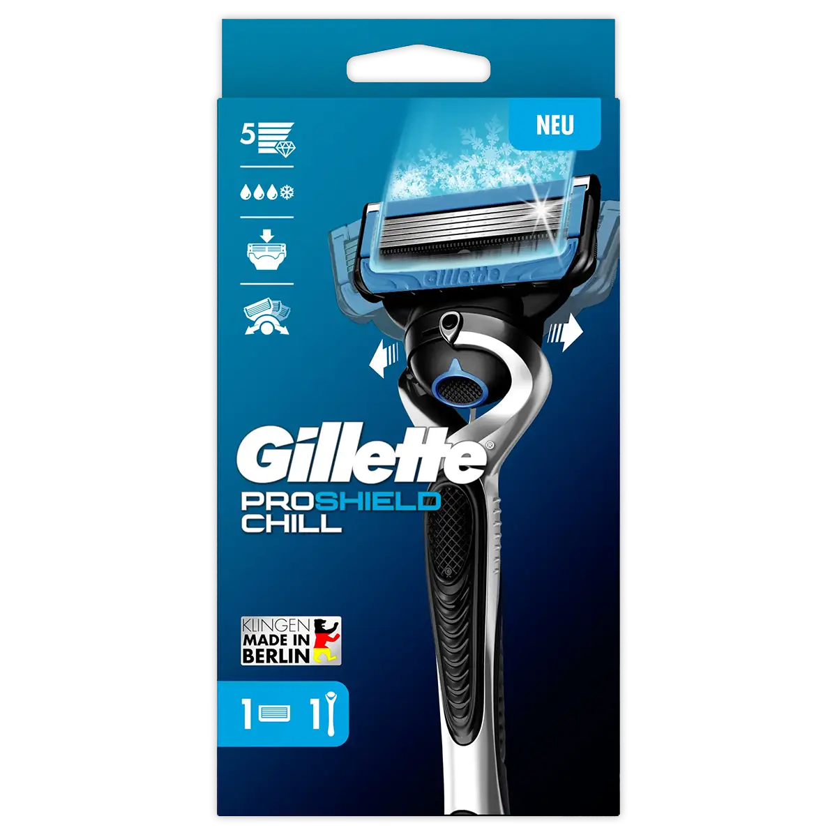 Ontdek het Gillette ProShield Chill Scheermes met koelende strip en precisietrimmer. Voor een gladde, verkoelende scheerbeurt zonder irritatie!
