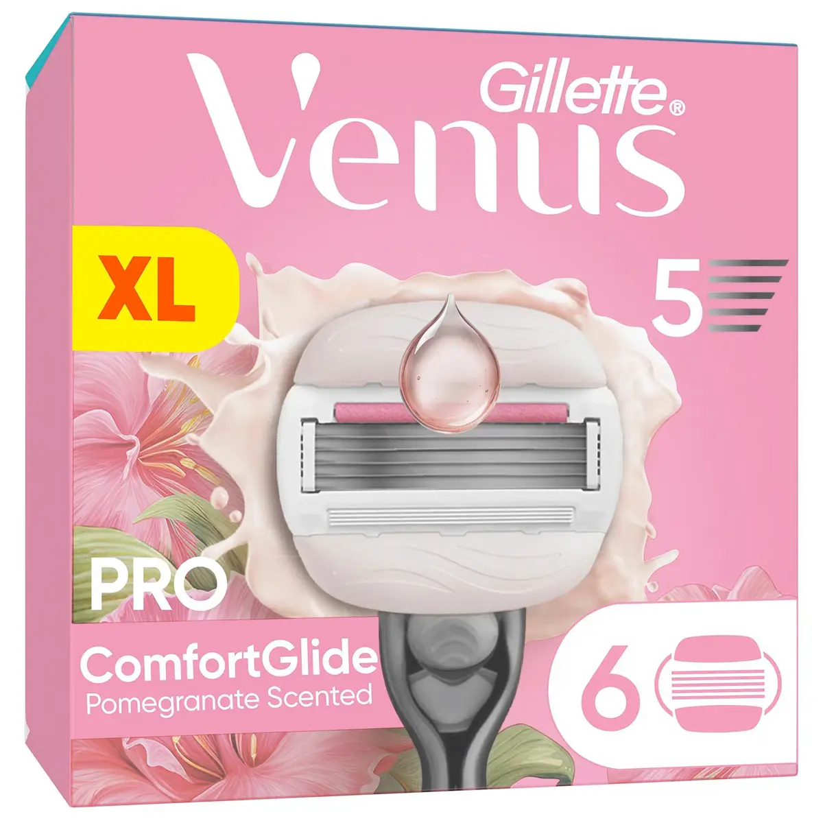 Gillette Venus Pro ComfortGlide 6x scheermesjes met 5 bladen, hydraterende strip & granaatappelgeur. Voor een gladde, zachte huid – zelfs bij gevoeligheid.