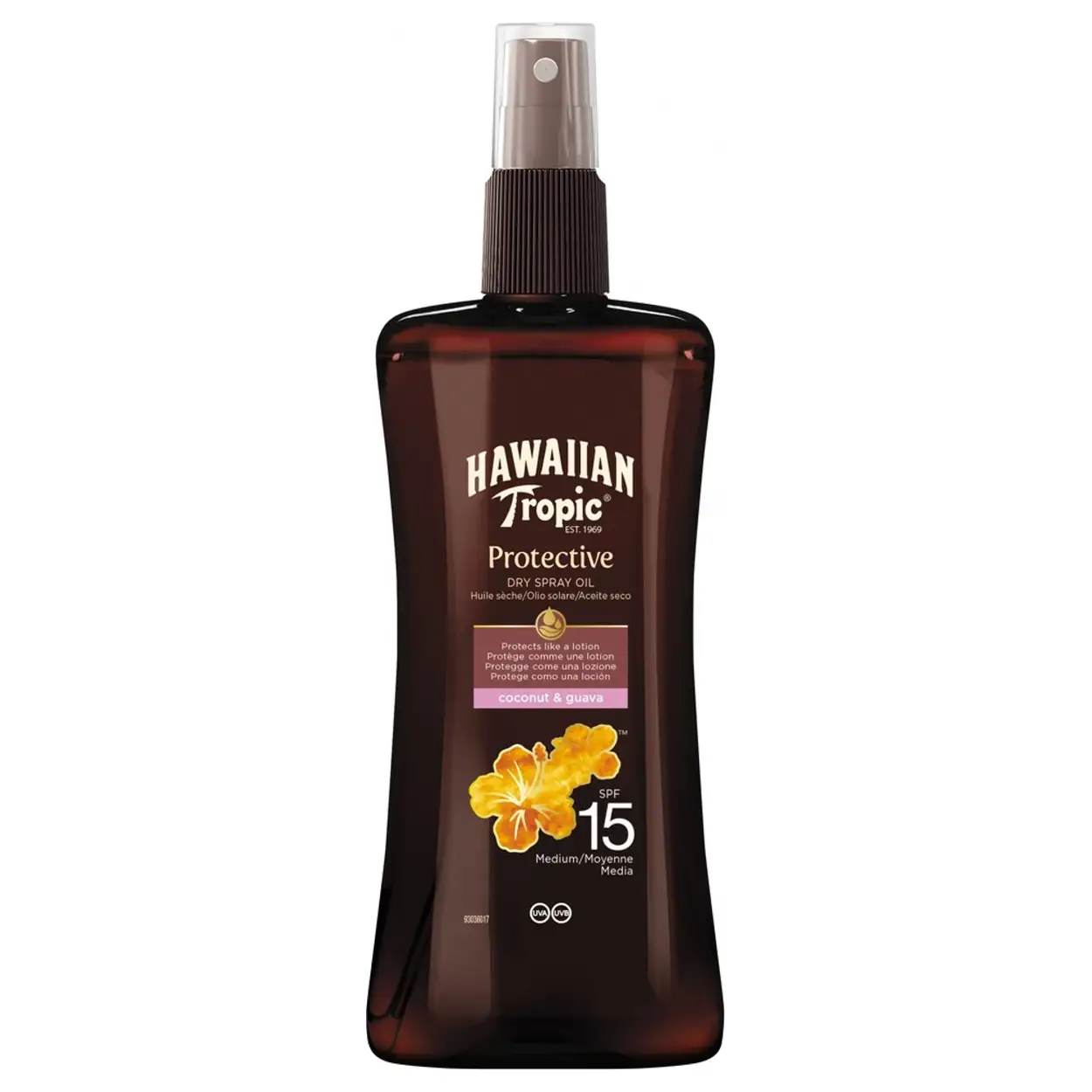 Bescherm en hydrateer je huid met Hawaiian Tropic Zonneolie Dry Spray SPF15. Voedende kokos- en guaveolie, tropische geur en waterbestendige formule!