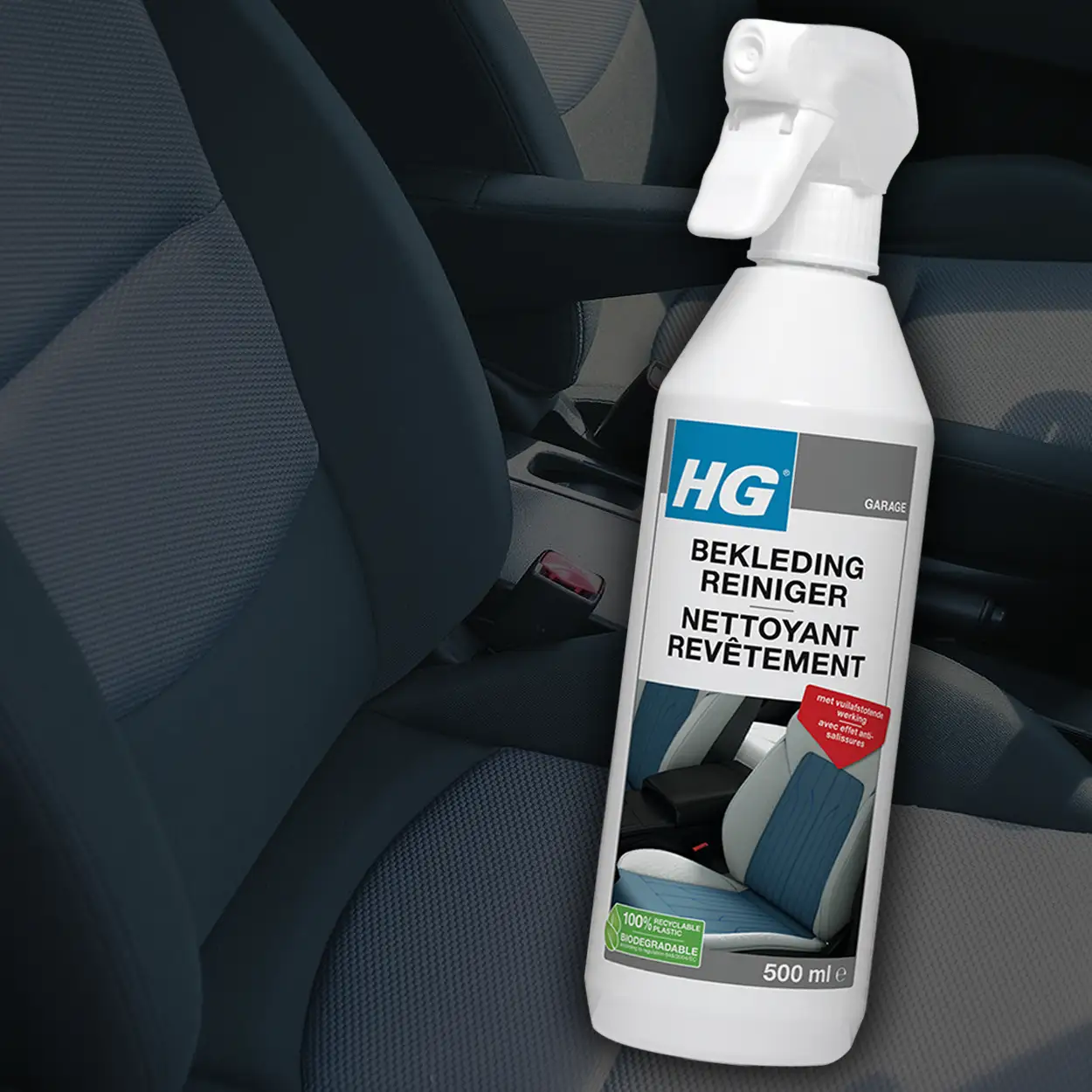 Verwijdert hardnekkige vlekken uit auto-, caravan- en bootbekleding. HG Bekledingreiniger 500ml Reinigt veilig en laat een onzichtbare vuilafstotende laag achter na gebruik.
