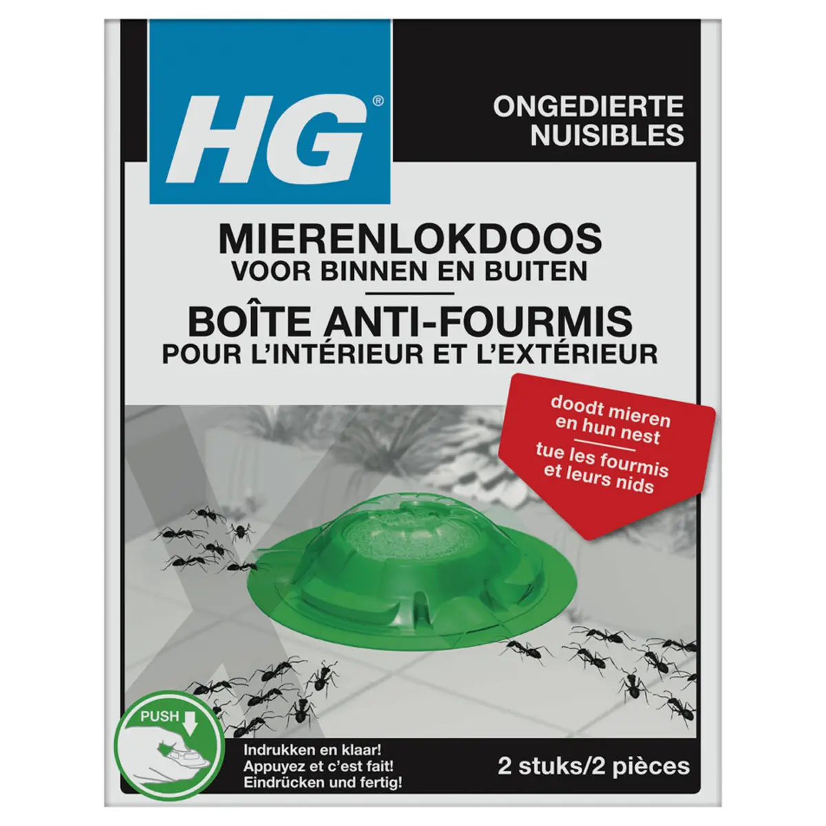 Pak mieren bij de bron aan met HG Mierenlokdoos BUITEN. Doodt het hele nest snel, schoon en effectief. 2 stuks voor langdurig resultaat.