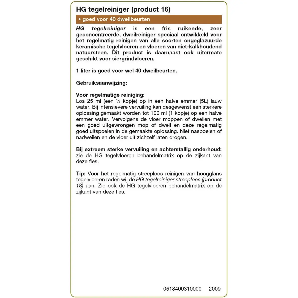 Met de HG Tegelreiniger wordt dweilen weer een feestje. Deze krachtige, fris ruikende vloerreiniger is speciaal ontwikkeld voor alle soorten tegelvloeren, niet-kalkhoudende natuursteen én siergrindvloeren. Dankzij de zeer geconcentreerde formule is één liter goed voor maar liefst 40 dweilbeurten – zuinig in gebruik én super effectief.