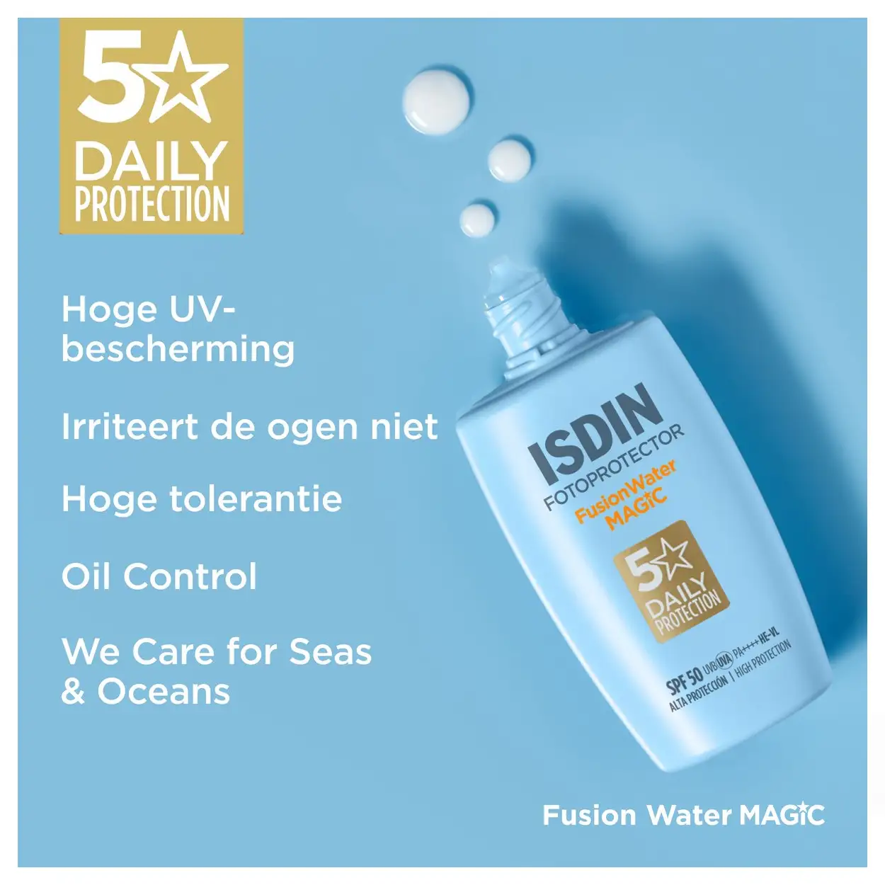 De ISDIN Fotoprotector Fusion Water Magic Zonnebrand Gezicht SPF50 50ml is dé dagelijkse must-have voor wie maximale zonbescherming wil zonder een plakkerig of vettig gevoel. Deze innovatieve gezicht zonnebrand op waterbasis trekt razendsnel in en laat geen witte waas achter. Ideaal onder make-up of als lichte dagverzorging tijdens zonnige dagen.