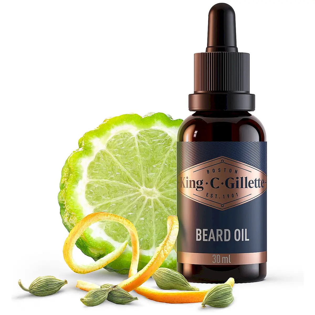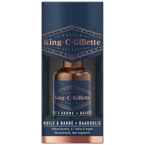 King C Gillette Baardolie 30ml hydrateert, verzacht en verzorgt gezichtshaar en huid. Met mannelijke geur, plantaardige oliën en recyclebare verpakking.