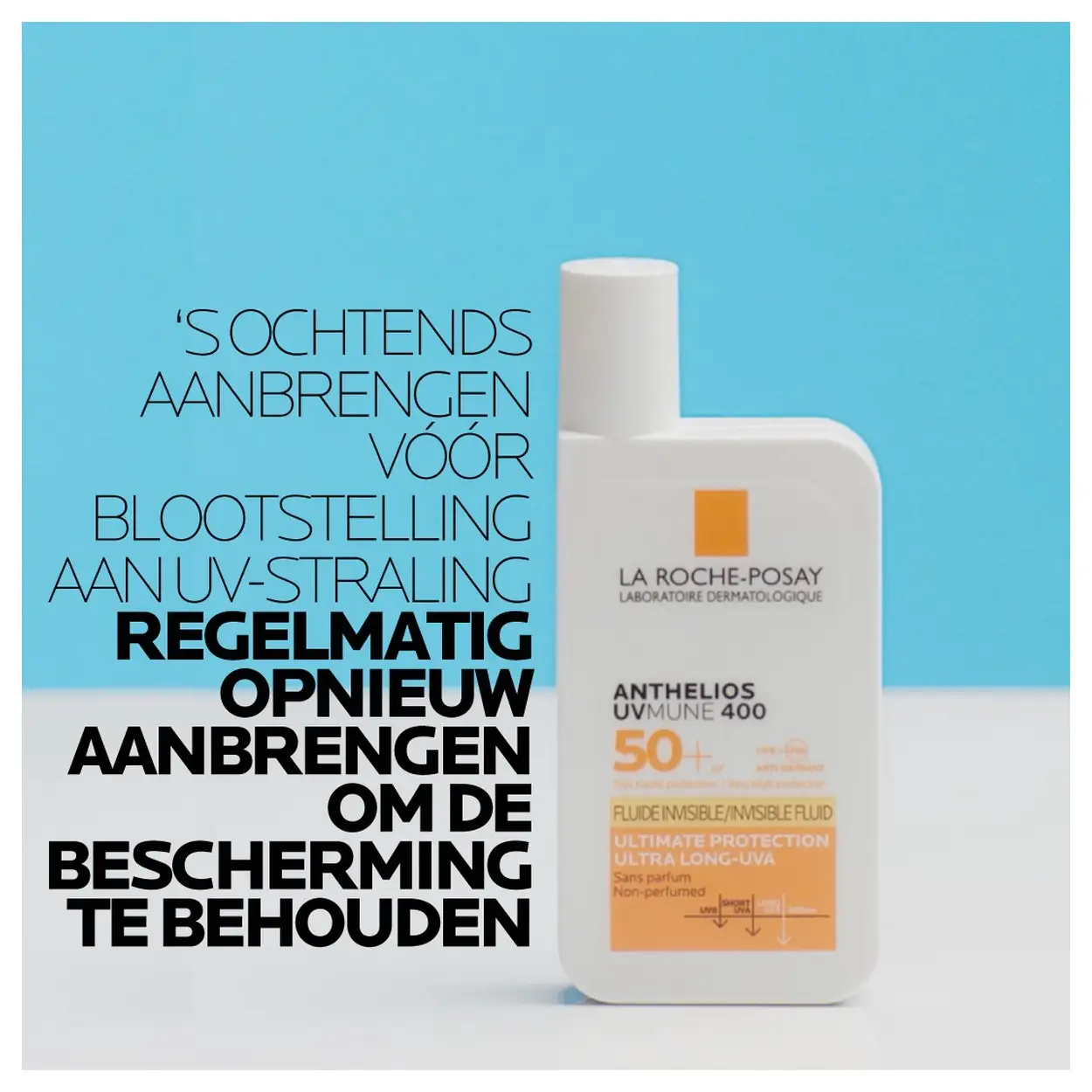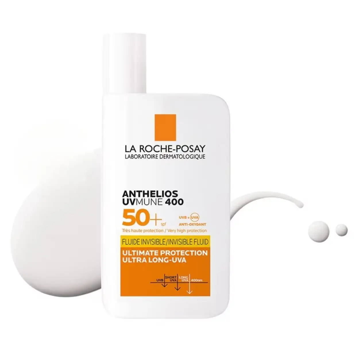 Ultralichte, geurvrije La Roche-Posay Anthelios UVMUNE 400 Onzichtbare Zonnebrand Fluide SPF50 voor face. Zeer hoge bescherming tegen UVA/UVB, water‑ en zweetbestendig en getest op alle huidtypes. Veilig, fris, dagelijks.