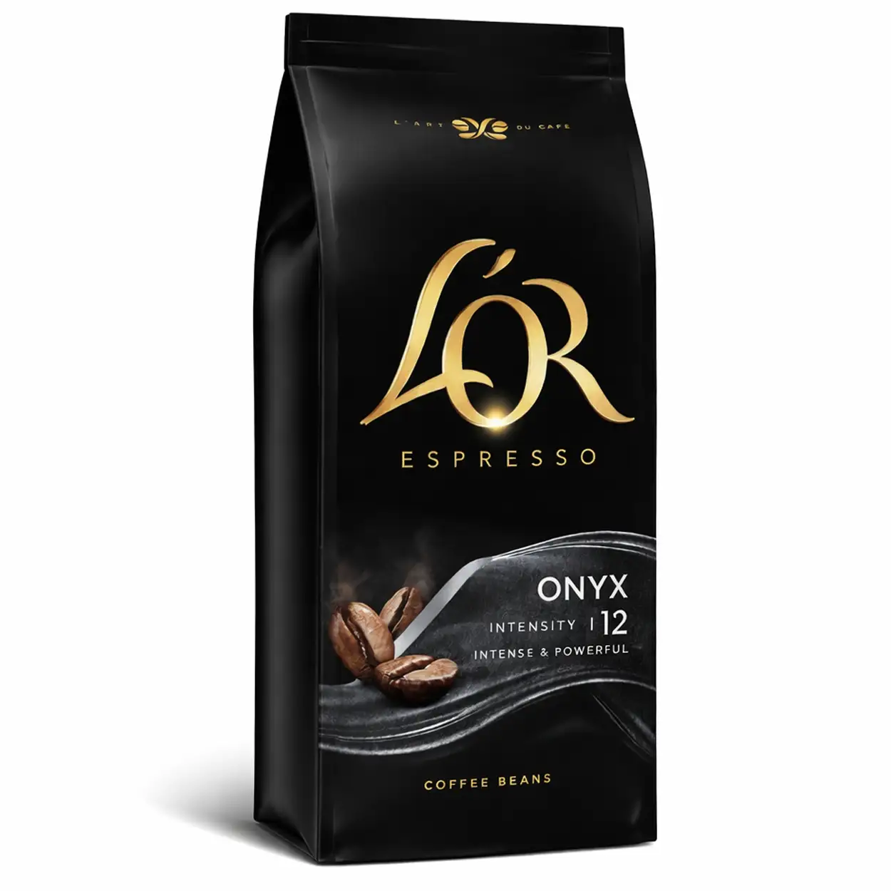 Intense espresso met kracht en body. Donker gebrande koffiebonen intensiteit 12. L’Or Espresso Onyx koffiebonen 500gram perfect voor volautomaat en liefhebbers van sterke koffie.