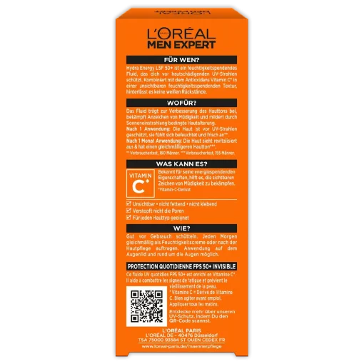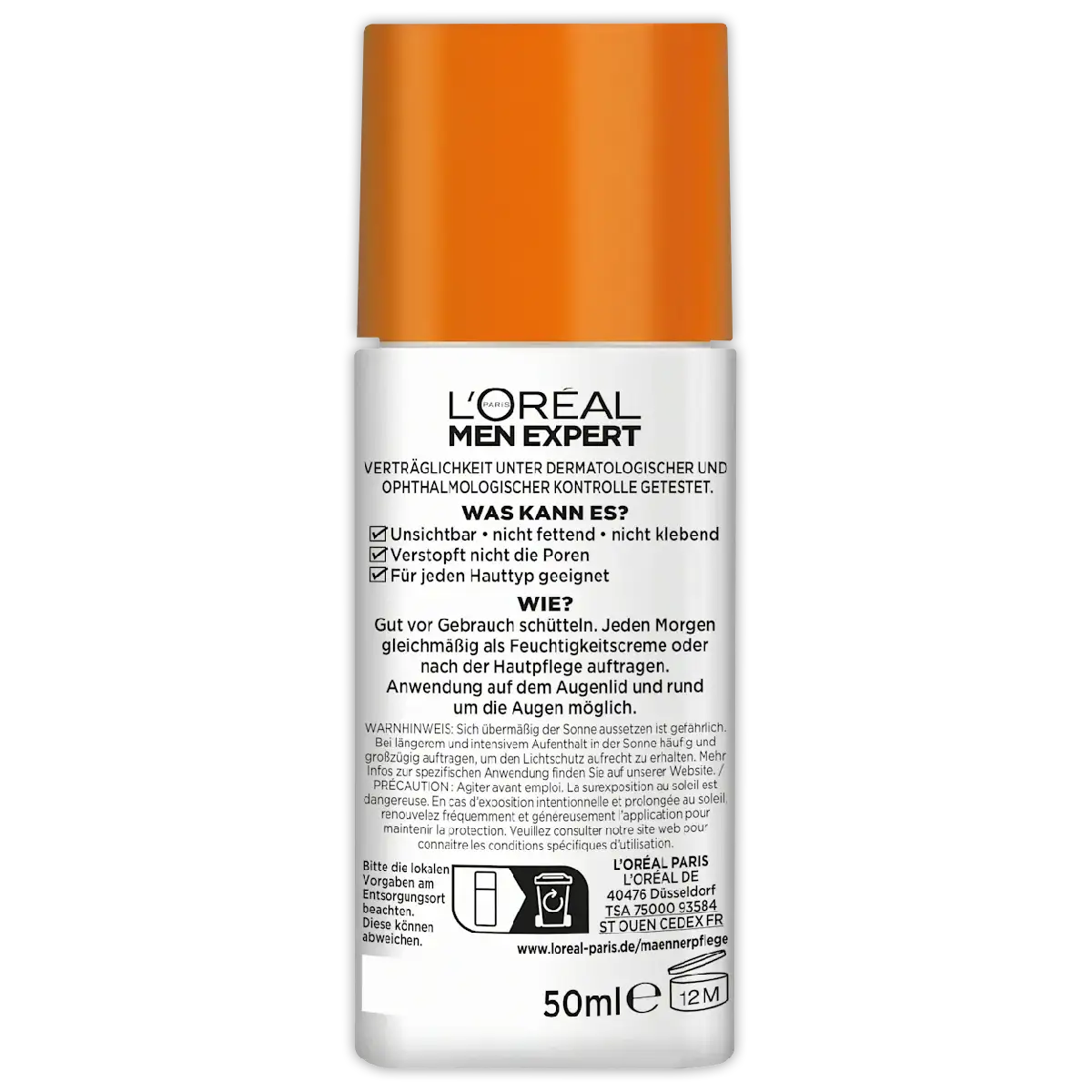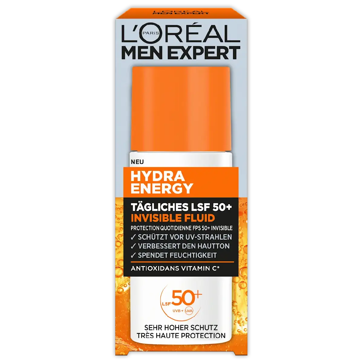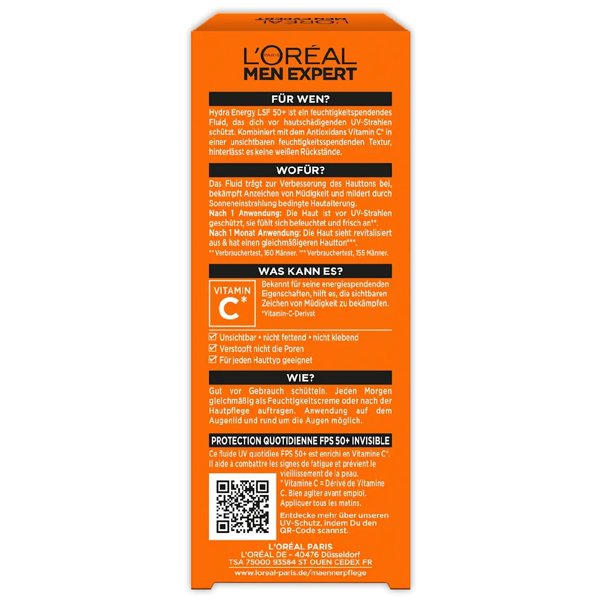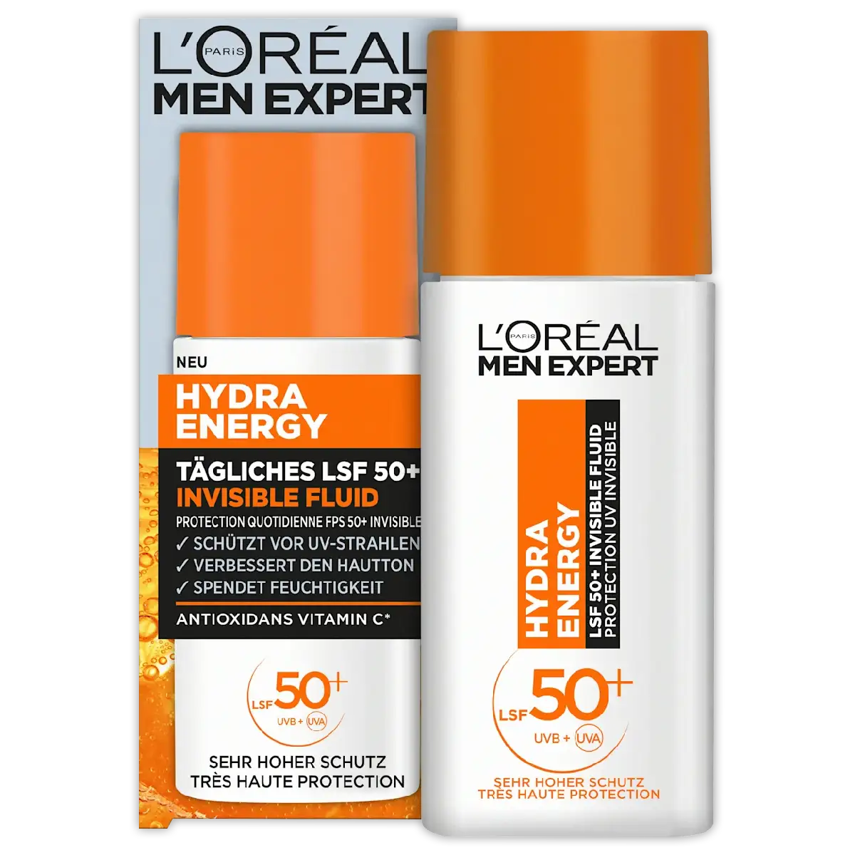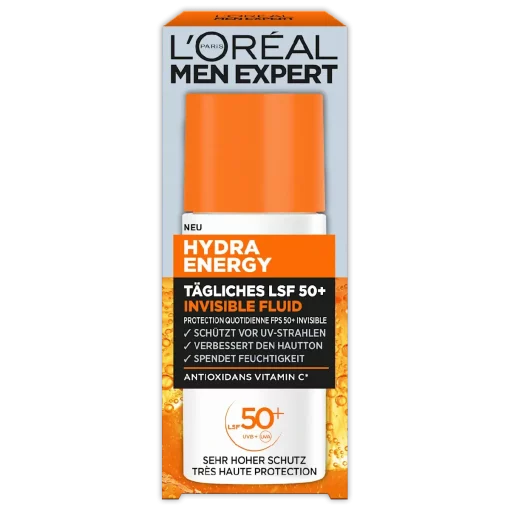 L’Oréal Paris Men Expert Hydra Energy SPF50 gezichtscrème hydrateert, beschermt en revitaliseert. Ultra-licht, waterresistent en verrijkt met vitamine C.