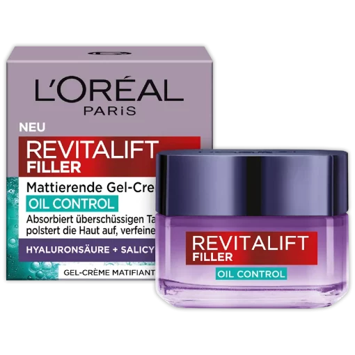 Zeg vaarwel tegen een glimmend voorhoofd en verwelkom een stralend matte huid met de L’Oréal Paris Revitalift Filler Oil Control Gel. Deze matterende dagcrème met hyaluronzuur en salicylzuur is jouw geheime wapen tegen overtollig talg, grove poriën en een doffe teint.