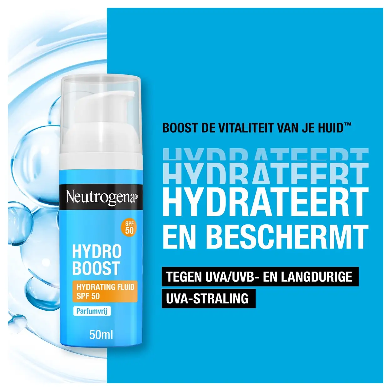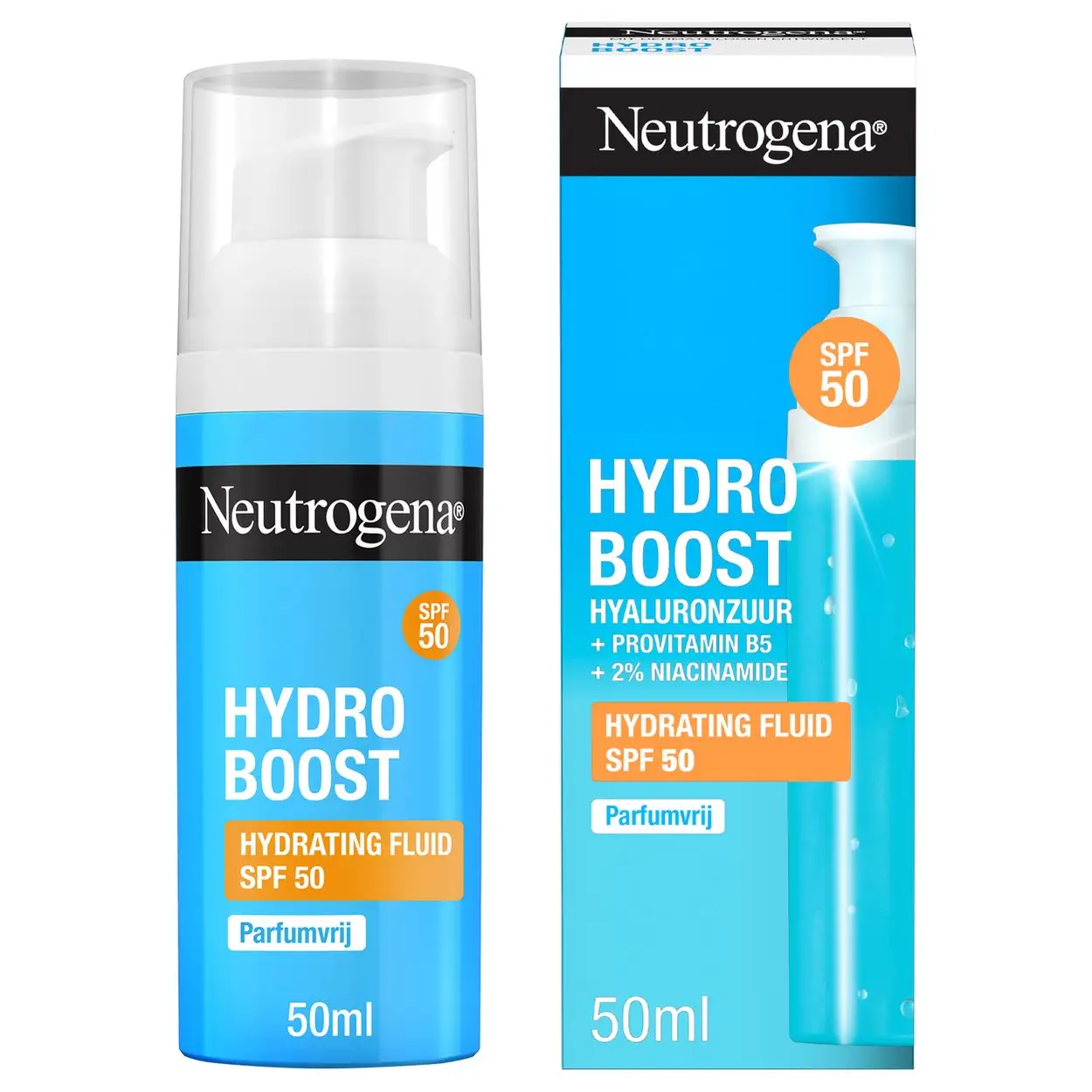 Hydraterende gezichtscrème met SPF 50 en hyaluronzuur. Neutrogena Hydro Boost Hydrating Fluid SPF50 beschermt, egaliseert en verzorgt de huid. Licht, parfumvrij en geschikt voor alle huidtypes.