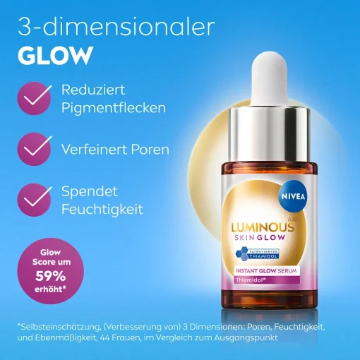 Ontdek het NIVEA Serum Luminous Skin Glow, het geconcentreerde gezichtsserum dat je huid van binnenuit verheldert en laat stralen. Met een krachtige combinatie van anti-age ingrediënten en pure foliumzuur stimuleert dit serum de celvernieuwing en geeft het je huid een voelbare opvulling en versteviging binnen 24 uur. Perfect voor wie droomt van een jeugdig, egaal en stralend gezicht.