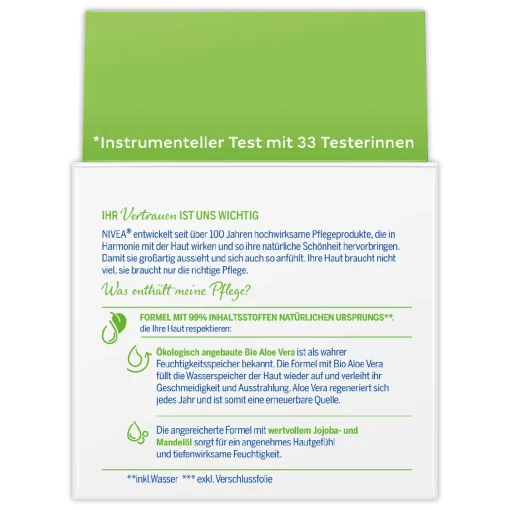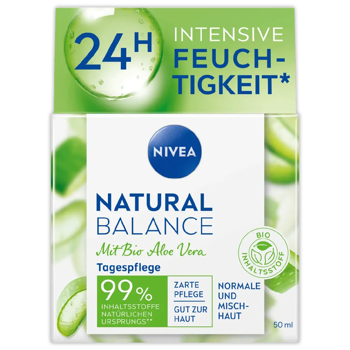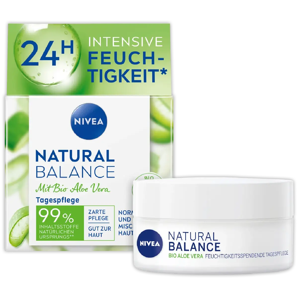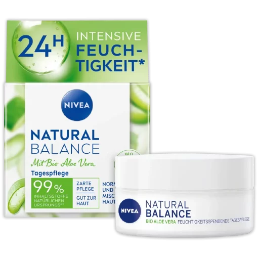 Verzorg je huid natuurlijk met NIVEA Natural Balance Dagcrème. Hydrateert 24 uur lang met aloë vera, jojoba- en amandelolie. Voor een frisse, gezonde glow.