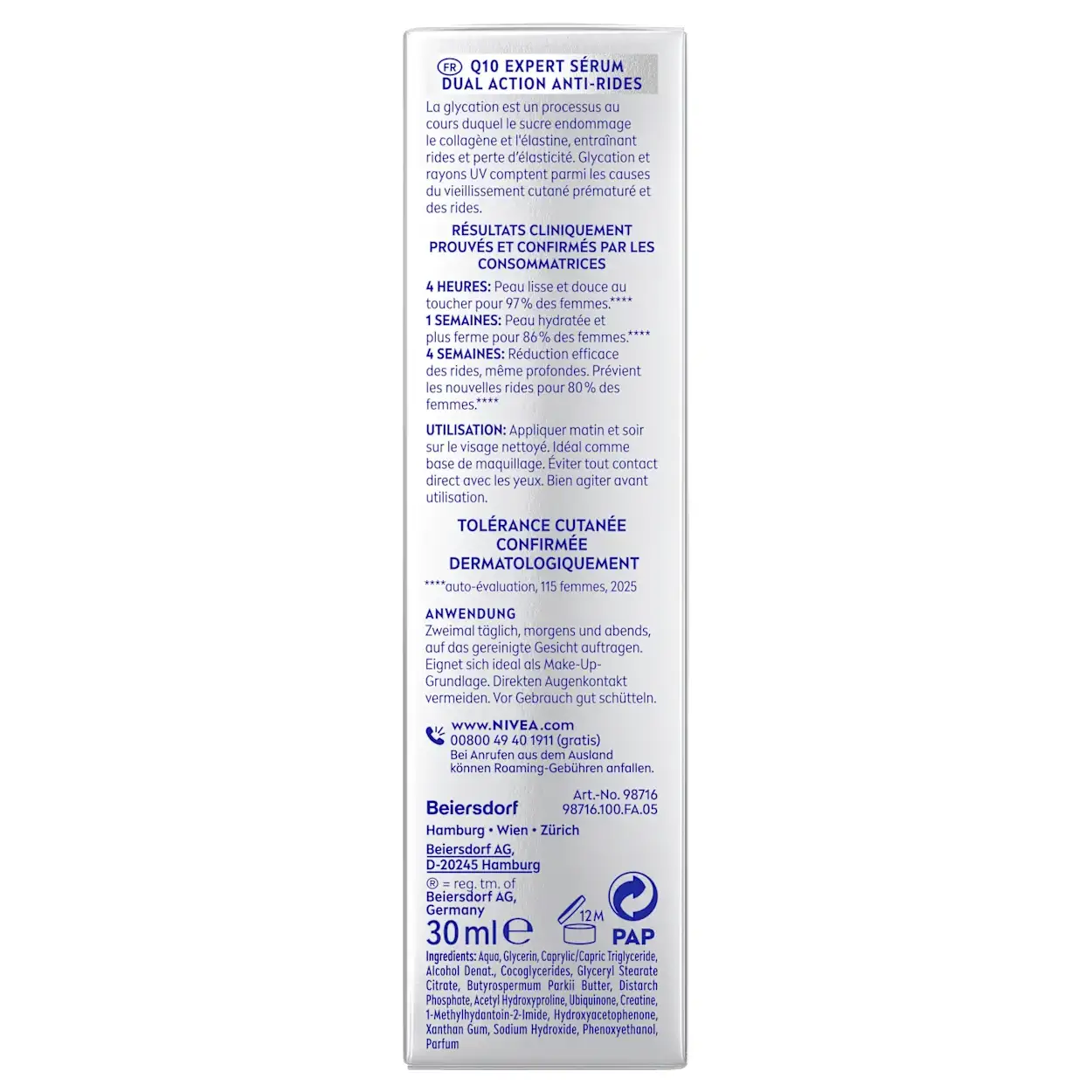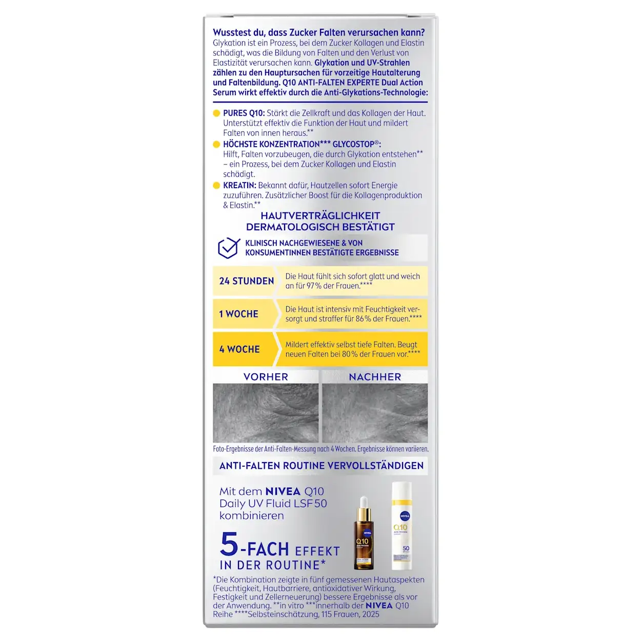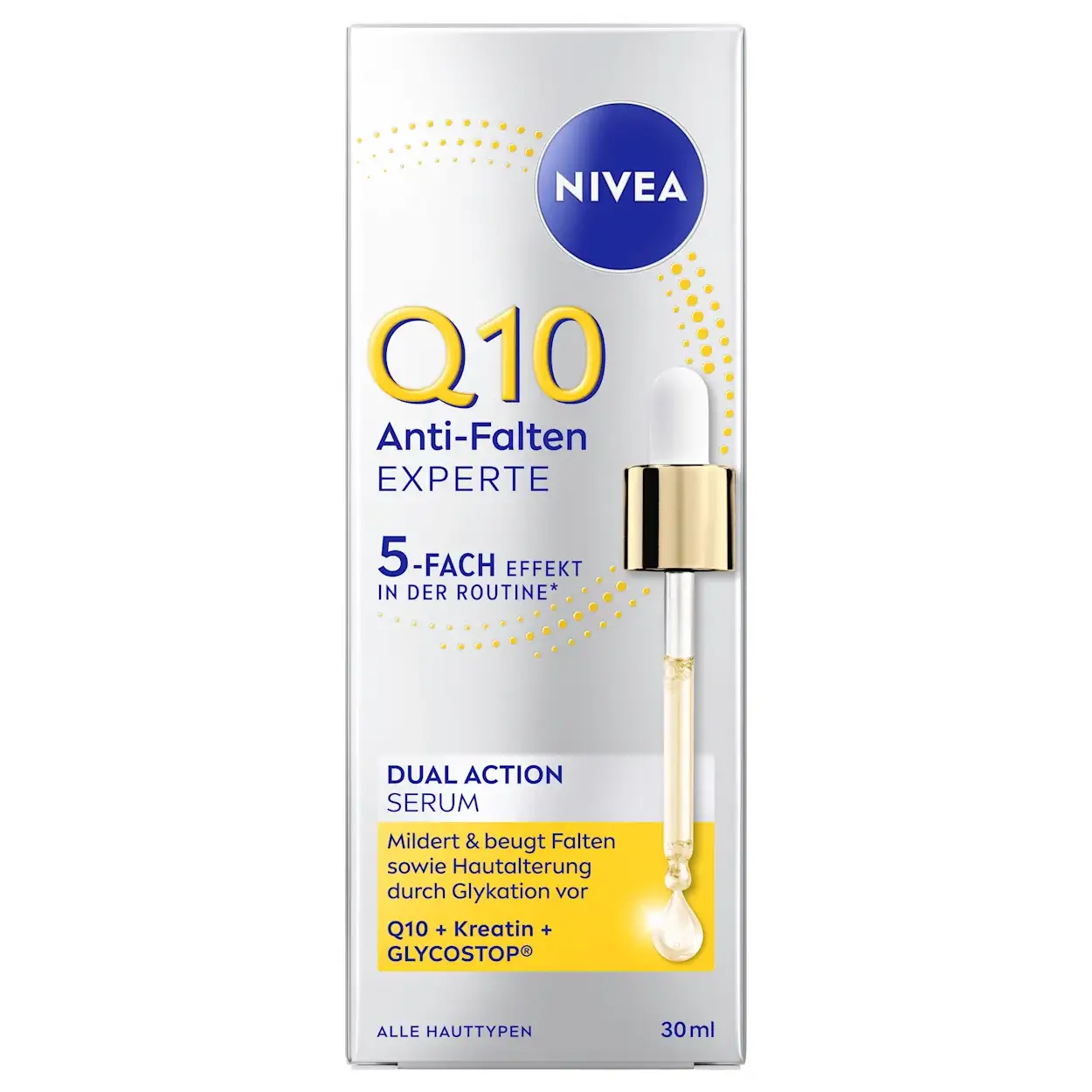 NIVEA Q10 Anti-Rimpel Expert Dual Action Serum 30ml vermindert rimpels en helpt nieuwe voorkomen. Voor een gladdere, stevigere huid in slechts 2 weken.