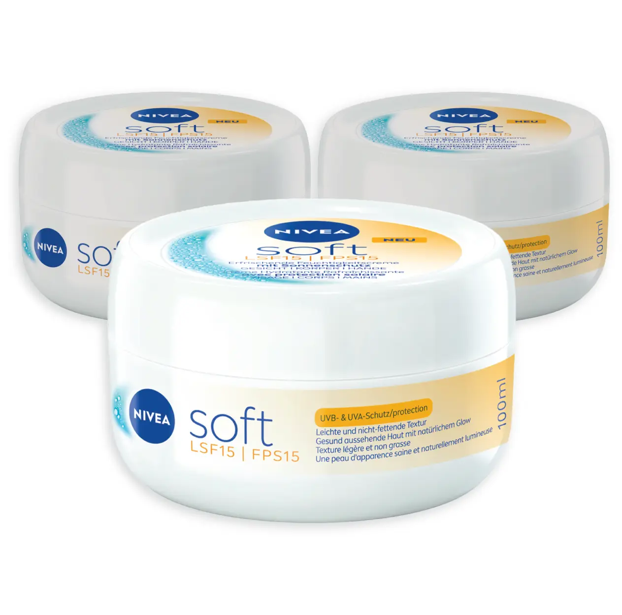 NIVEA Soft LSF15 crème 3-pack met vitamine E en jojoba-olie. 48u hydratatie en UV-bescherming voor gezicht, handen en lichaam. Licht en snel absorberend.