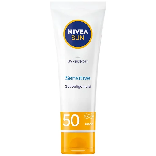 Parfumvrije Nivea Sun Face Sensitive Zonnebrand Gezicht SPF50 voor de gevoelige huid. Hydrateert, beschermt en verzacht – ideaal voor dagelijks gebruik op het gezicht.