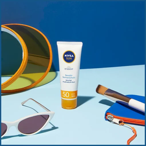 Laat jouw gevoelige gezichtshuid niet in de steek onder de zon! De NIVEA SUN Face Sensitive Zonnebrand Gezicht SPF50 biedt directe, betrouwbare bescherming tegen schadelijke uv-stralen én verzacht tegelijkertijd je huid.