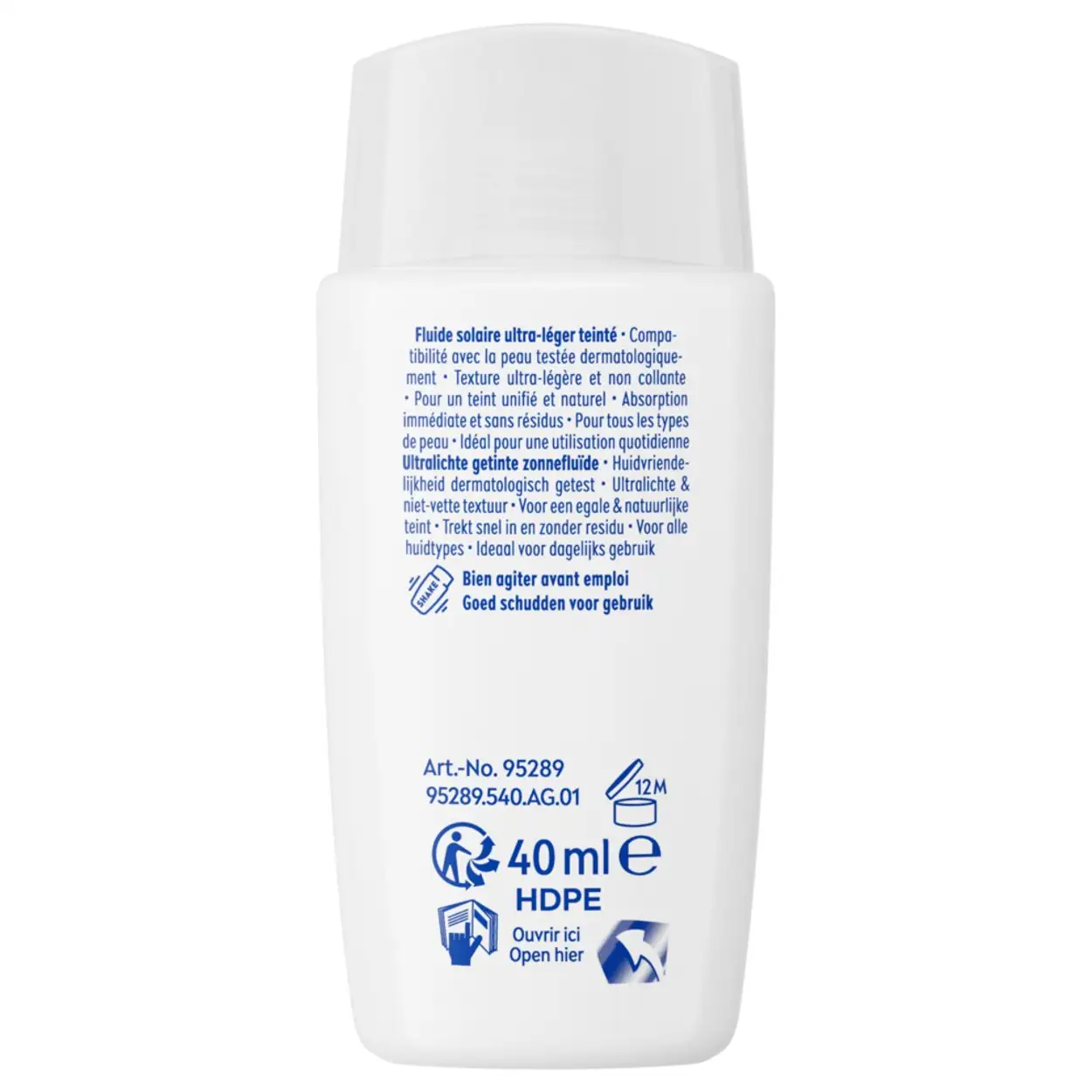 Ultralichte getinte NIVEA SUN UV Face Ultra Light SPF50 Medium Tinted voor het gezicht met SPF50+. Beschermt tegen UVA/UVB en blauw licht, hydrateert en geeft een matte, egale teint.
