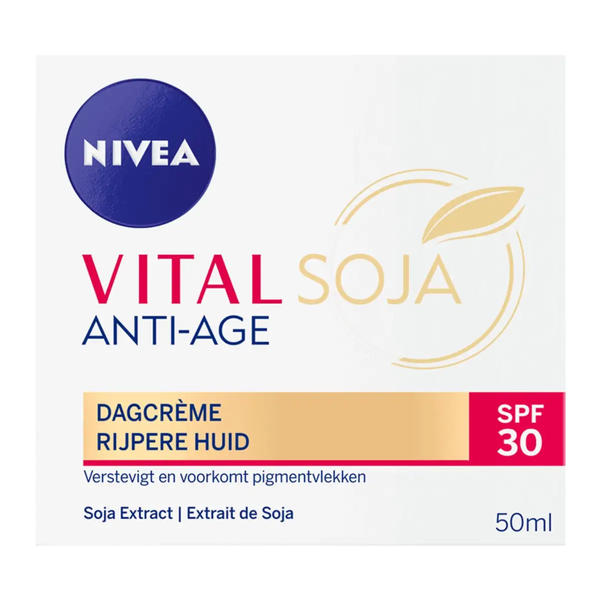 Verminder rimpels en pigmentvlekken met Nivea Vital Soja Anti-Age Beschermende Dagcrème SPF30. Intensieve hydratatie en bescherming voor een jeugdige, egale huid.