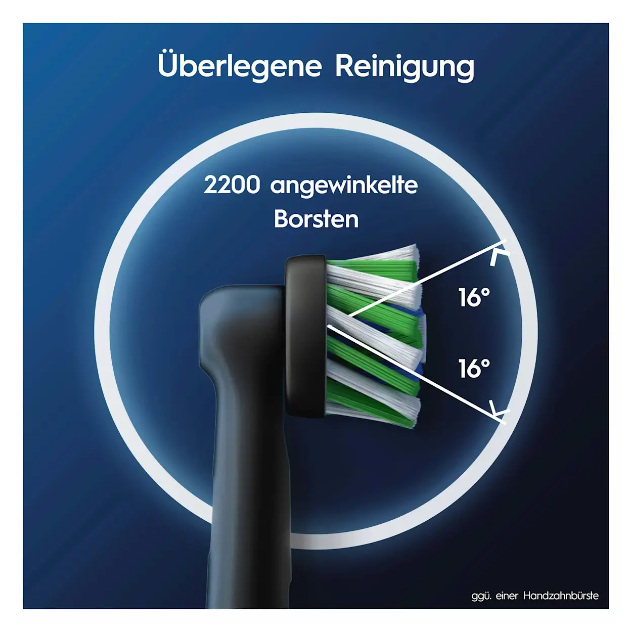 De CrossAction-technologie met borstelharen onder een hoek van 16° sluit naadloos aan op elke tand. Dit zorgt voor een grondige en gelijkmatige reiniging, zonder moeite. Met meer dan 2200 borstelharen per opzetborstel haal je het maximale uit je elektrische tandenborstel.