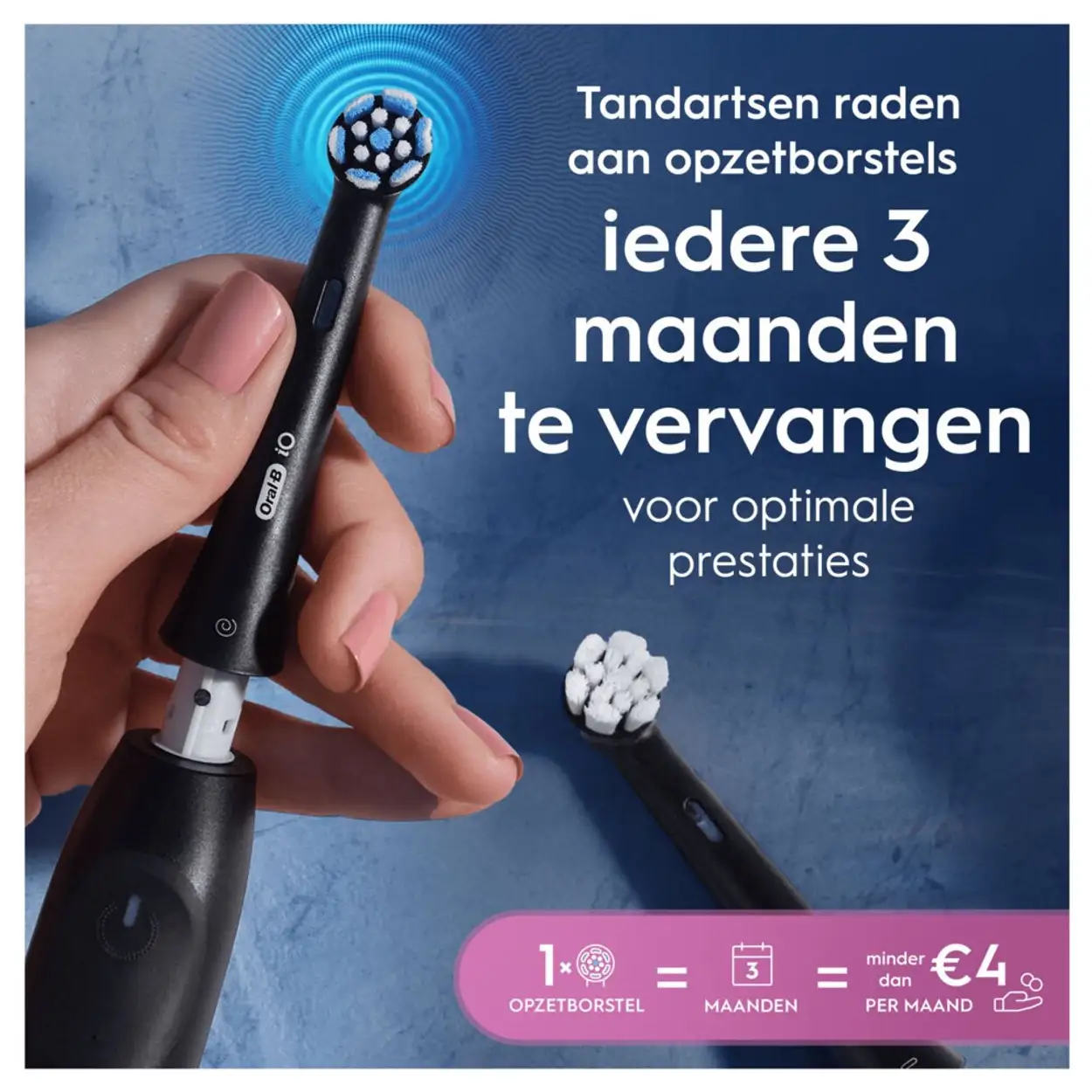 Voor een optimale mondverzorging adviseren tandartsen om je opzetborstel elke 3 maanden te vervangen. Daarom zijn de Oral-B iO Gentle Care opzetborstels uitgerust met kleurveranderende borstelharen.