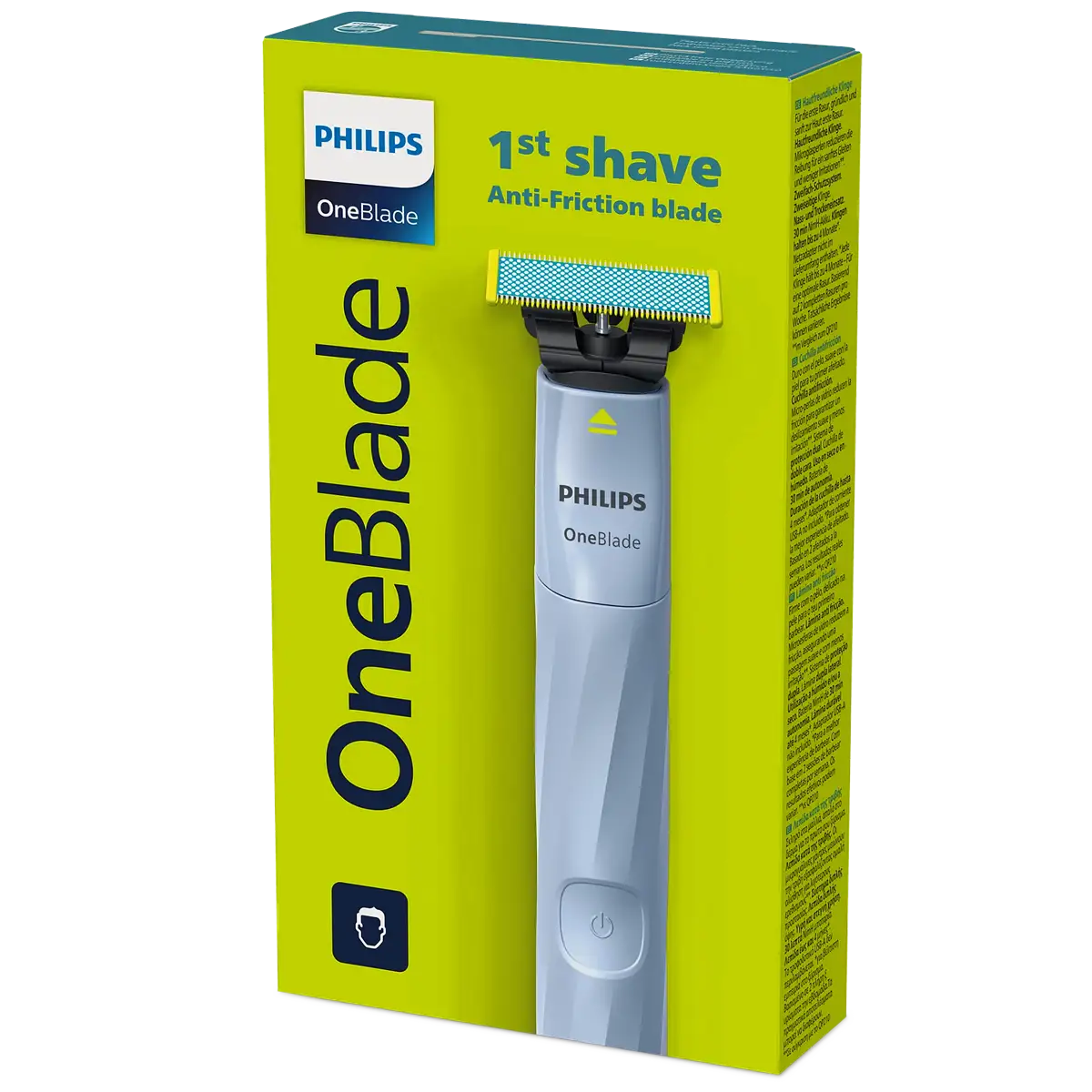 De Philips OneBlade First Shave scheert, trimt en stylet zonder irritatie. Waterdicht, met dubbelzijdig mes en 30 minuten draadloos gebruik.