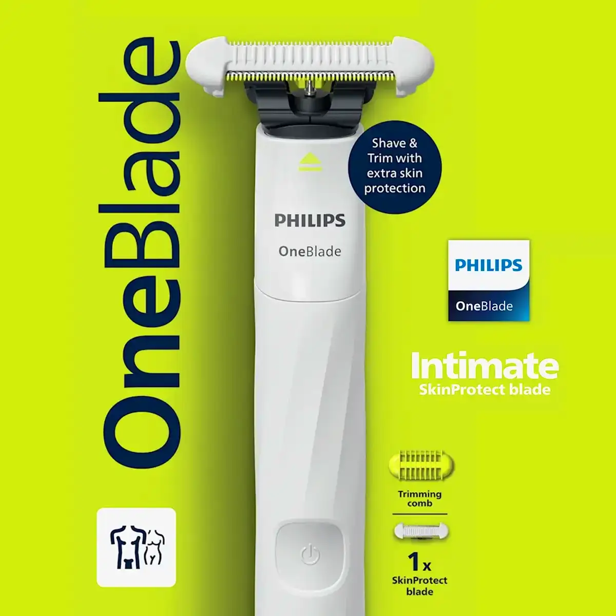 | Verpakkingsinhoud | OneBlade Intimate, SkinProtect Blade, Trimkam (3mm), USB-A kabel |