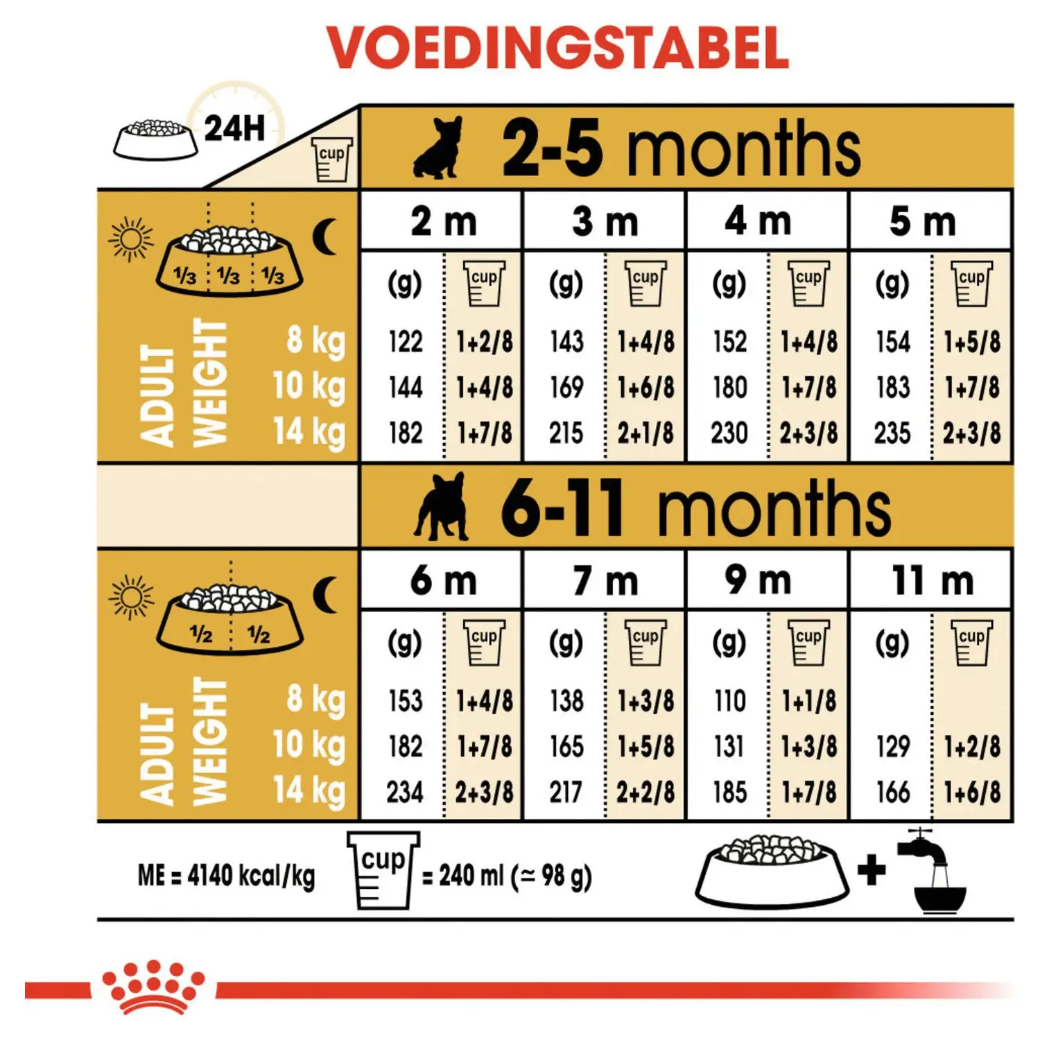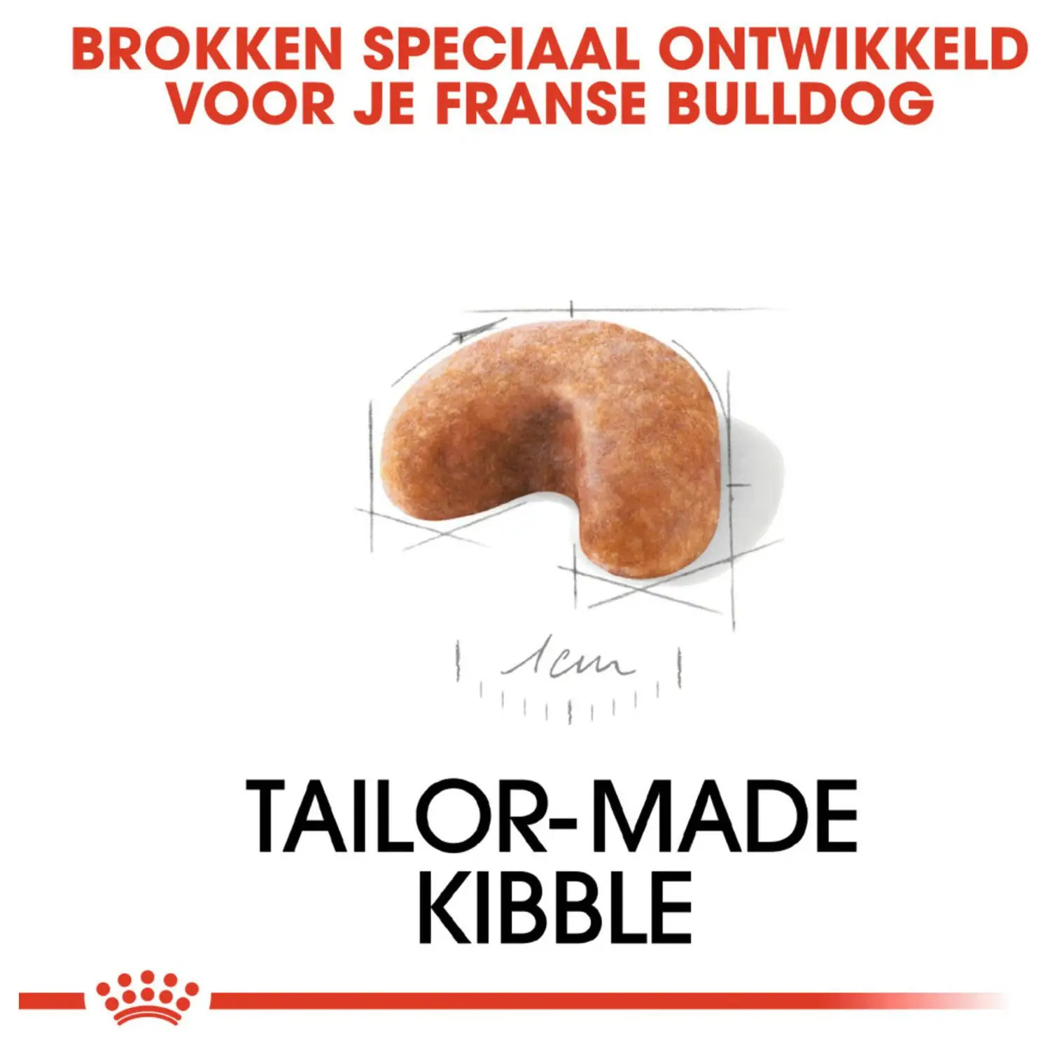 Franse bulldogs hebben een kortere schedel, waardoor kauwen soms een uitdaging kan zijn. Royal Canin heeft de vorm, grootte en textuur van de brokjes speciaal aangepast aan dit ras. Dit maakt het oprapen en kauwen makkelijker én bevordert een langzamere voedselopname, wat goed is voor de spijsvertering.