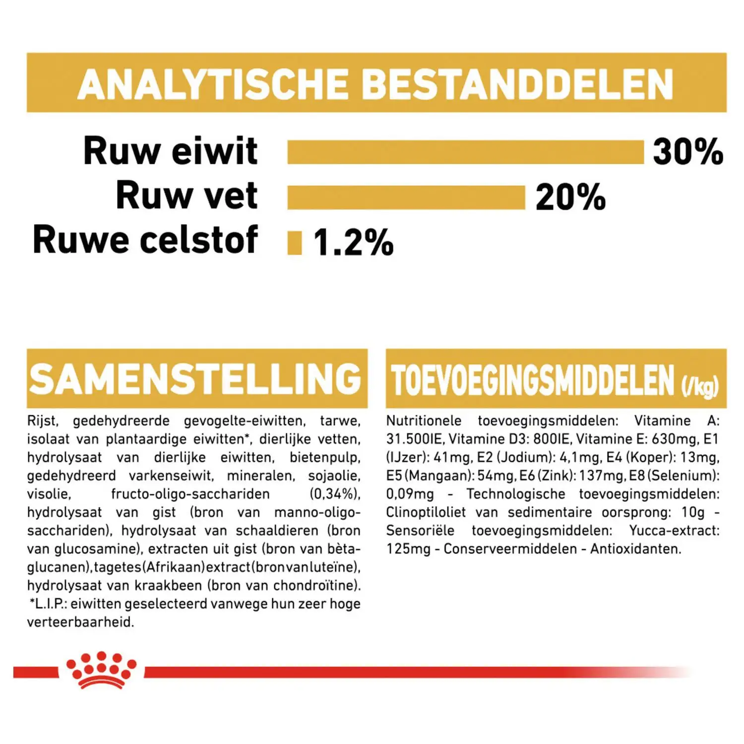 | Analytische bestandsdelen | ANALYTISCHE BESTANDDELEN: Ruw eiwit: 30,0% – Ruwe celstof: 1,2% – Ruw vet: 20,0% – Ruwe as: 8,0%. |