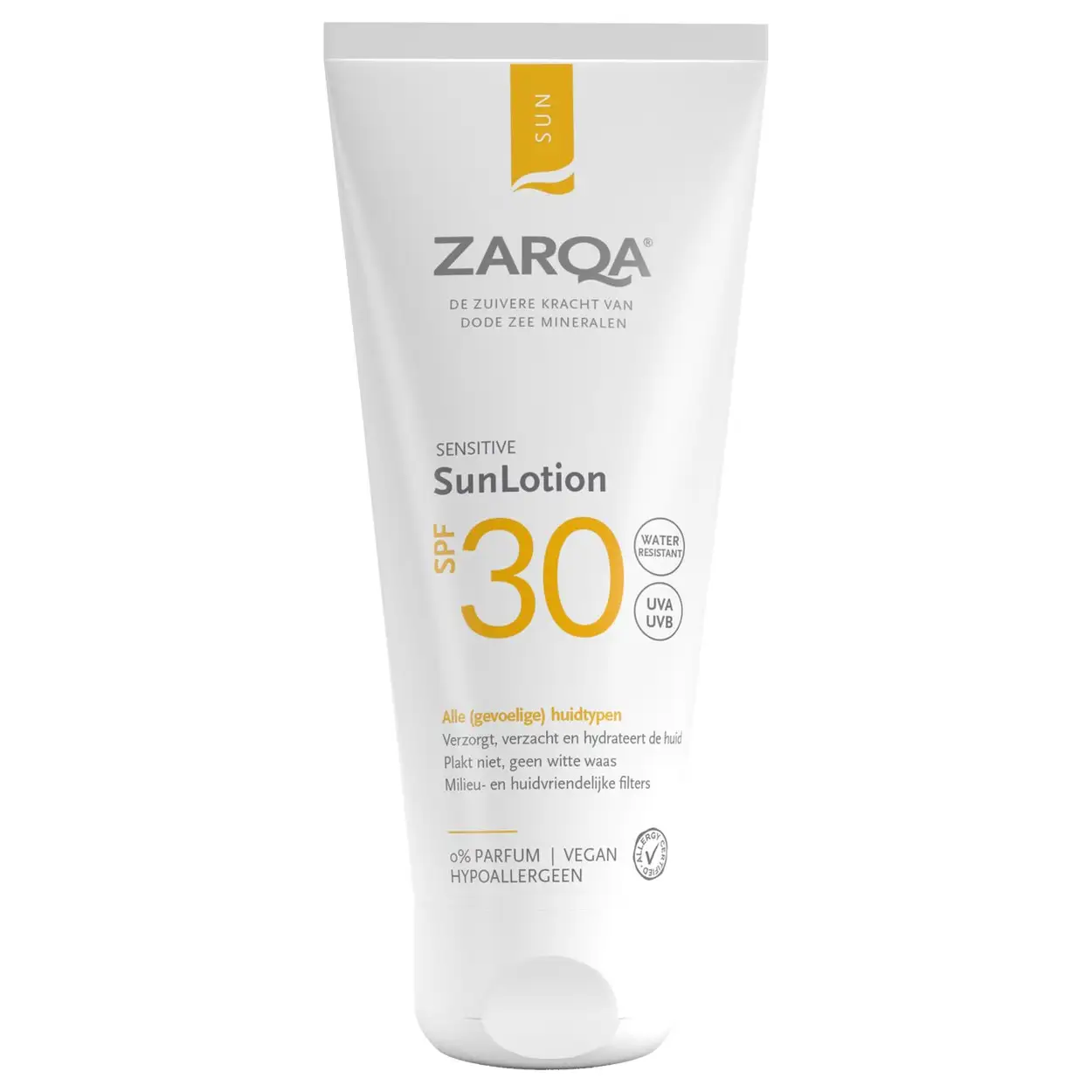 Parfumvrije ZARQA SunLotion SPF30 Sensitive 200ml voor gevoelige huid. Hydraterend, vegan en zonder witte waas. Intensieve UVA/UVB bescherming.