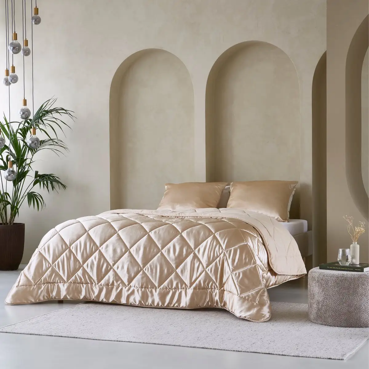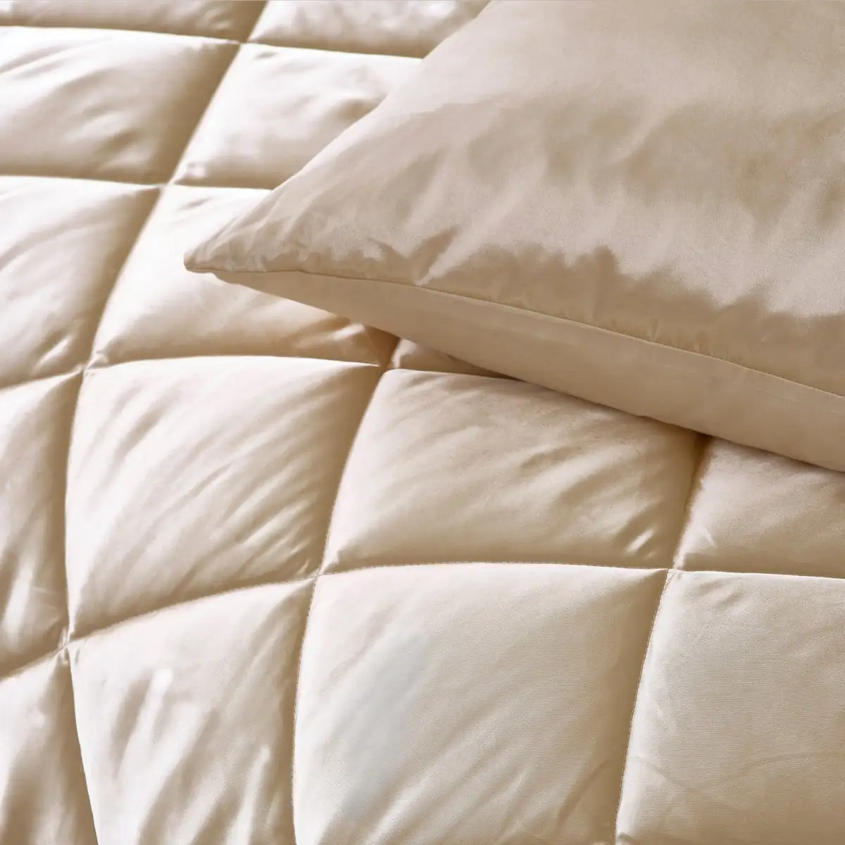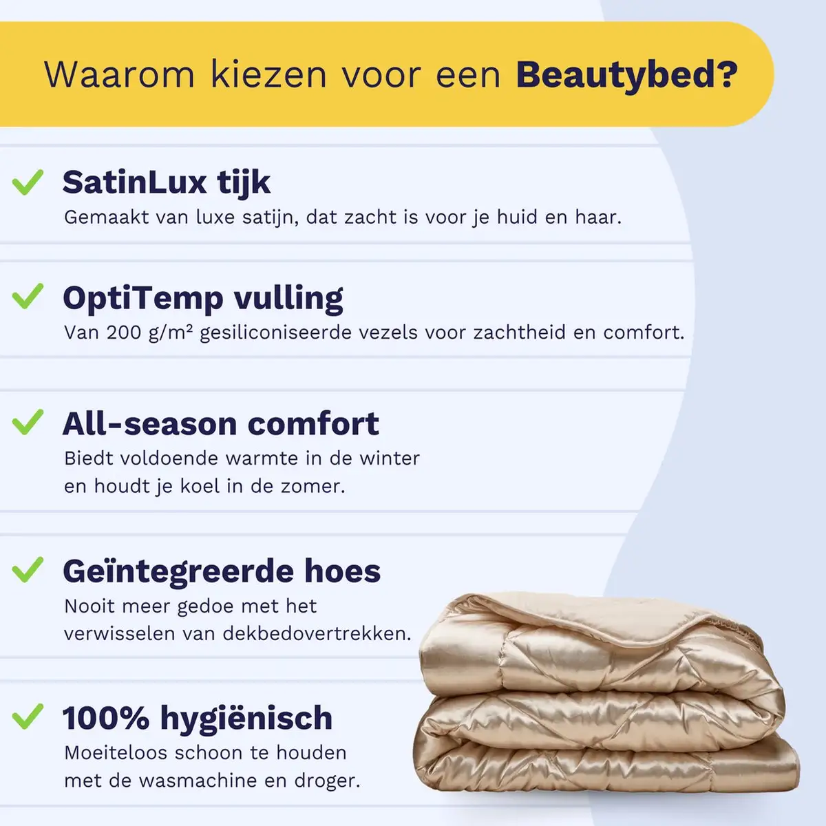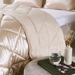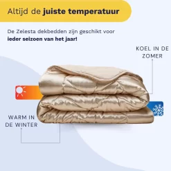 Ontdek het Zelesta Beautybed Champagne 240x200cm: luxe satijnen hoesloos dekbed, wasbaar, hypoallergeen en temperatuurregulerend. Ultiem comfort en gemak!