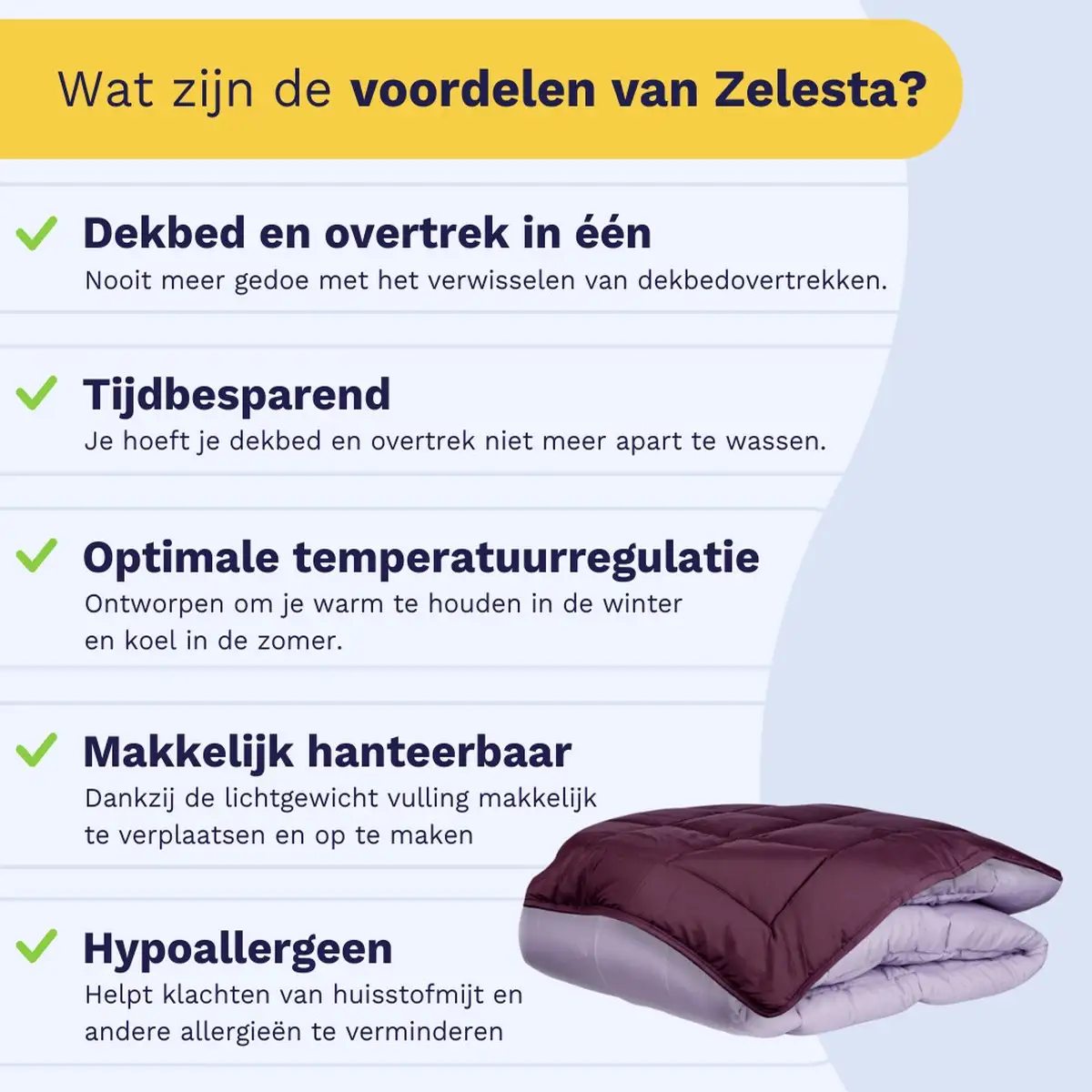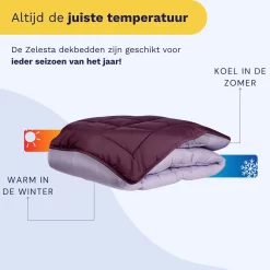 Ontdek het gemak van het hoesloze Zelesta Easybed Paars en Lila 240x220cm. Wasbaar, hypoallergeen en all year dekbed. Fris, snel droog en heerlijk comfortabel!