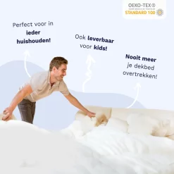 Het Easybed dekbed maakt schoonmaken eenvoudig. Geen losse overtrekken meer, je wast gewoon het dekbed zelf. Binnen 1 à 2 uur droog in de buitenlucht of met een kort programma in de droger. Zo stap je altijd in een bed dat écht schoon en fris is – met de geur van je favoriete wasverzachter.