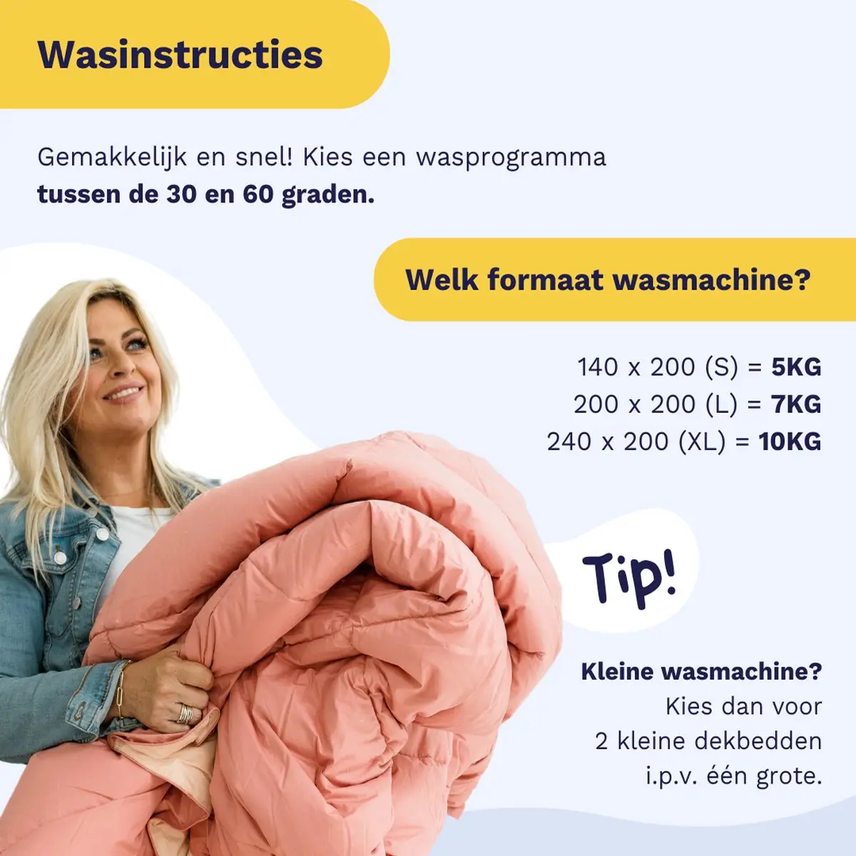 Fantastisch, snel binnen, snel gewassen, snel drogen en er ondergekropen. Lekker licht, luchtig en zacht.Het wasvoorschrift werd een paar dagen later opgestuurd, dat was een beetje dom. Ik was nieuw beddengoed altijd voor gebruik, maar het is goed gegaan. 40gr op kreukvrij en kreukvrij in de droger.Het dekbed van 220x 160 paste in mijn machine 7 kilo en in de droger 9 kilo . Een 2 persoons zou te groot zijn. Ik ben er heel blij mee. Geen hobbels en bobbels meer in een hoes, niet meer strijken en geen acrobatentoeren meer om het dekbed in een hoes te krijgen.