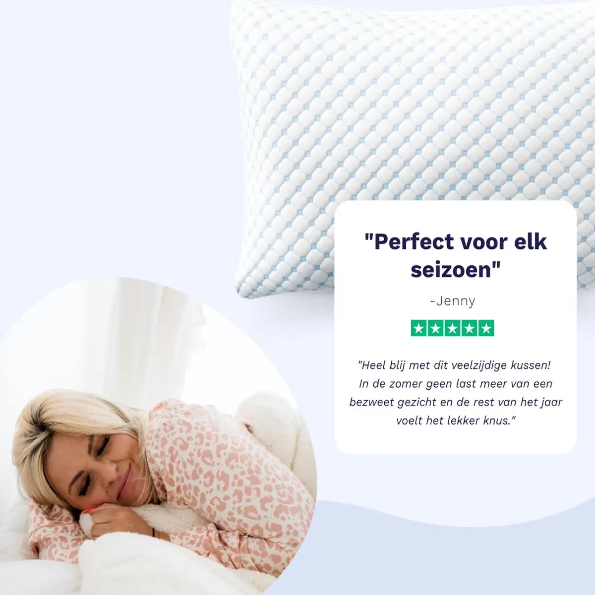 Dankzij de innovatieve Blue Cell® Technology blijft het kussen koel tijdens warme nachten, terwijl de zachte bamboestof warmte en comfort biedt in de winter. De wasbare tijk maakt het kussen extra hygiënisch en gemakkelijk fris te houden. Zo geniet je elke nacht van een schoon, gezond en comfortabel slaapoppervlak.